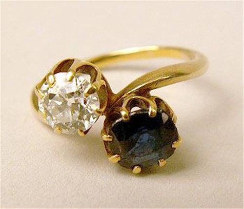 Set with one round sapphire and a similarly sized round diamond weighing .75 carats.