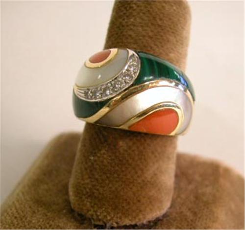 A 14K YELLOW GOLD, DIAMOND, CORAL AND MALACHITE RING