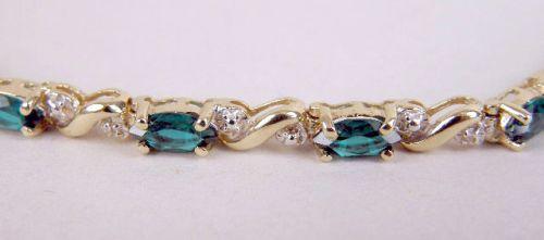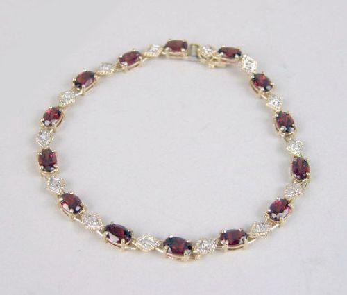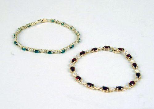 Containing 14 oval prong-set faceted garnets and 14 small bead-set diamonds within diamond-form plaques, gross weight apx. 5dwts. Together with a 10k yellow gold bracelet with synthetic green stones. 7 1/2", 7"l, respectivly