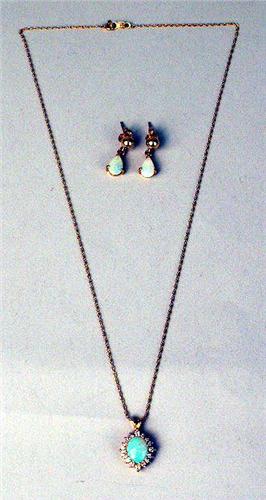 Set with a center oval opal surrounded by sixteen round cut diamonds on a 14K yellow gold fine chain. Together with a pair of 14K yellow gold and opal drop earrings. 3 pieces.
