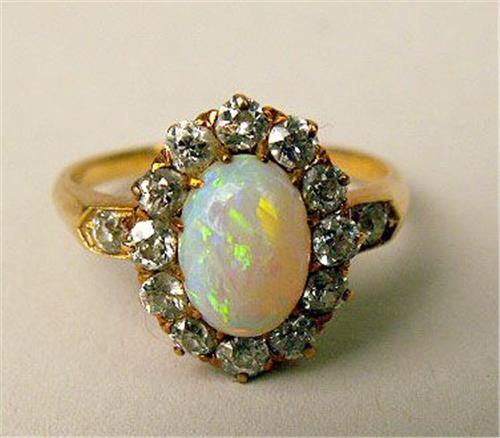 Set with a center oval opal surrounded by twelve full cut diamonds, with two round side diamonds, having a total weight of .75 carats.