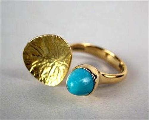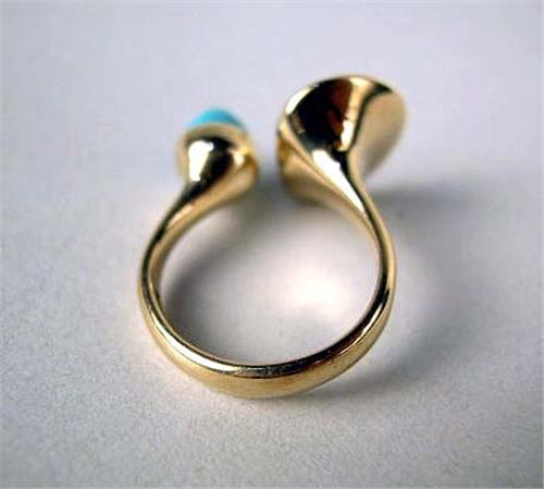 A 14K YELLOW GOLD RING WITH AN EXTENDED LEAF FORM And one small turquoise cabochon, apx. 5.5 dwt.