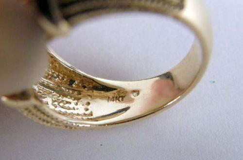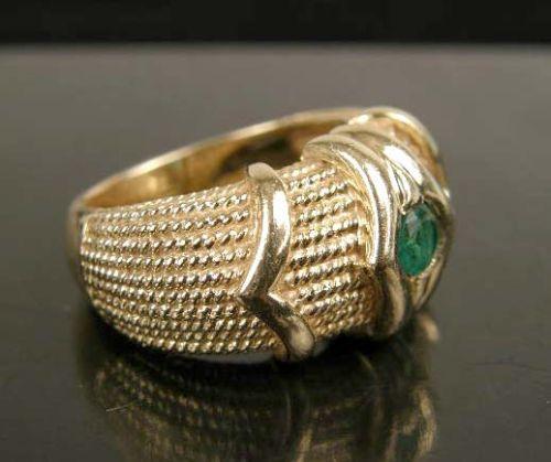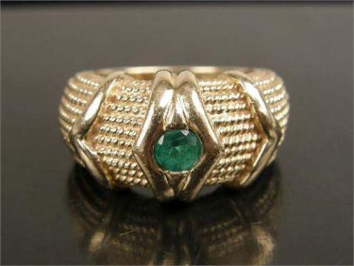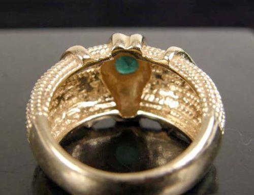Centered with a bezel-set green stone. 3/8"w, tapering