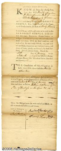 <B>A 1776 Partially Printed Document from the Press of John Dunlap, Printer of the Declaration of Independence</B></I> John Dunlap (1747-1812), famous printer, was born in Strabane, Ireland, in 1747. He died in Philadelphia, Pennsylvania, November 27, 1812. While a boy, he went to live with an uncle, William Dunlap, a printer and publisher in Philadelphia. At the age of 18, John Dunlap entered the business, and in November, 1771 began the publication of the <I>Pennsylvania Packet.</B></I> This paper was changed into a daily in 1784, the first in the United States, and afterward became the <I>North American and United States Gazette.</B></I> Mr. Dunlap was appointed printer to Congress, and first printed the Declaration of Independence. He was an officer in the first troop of Philadelphia cavalry, which became the body-guard of Washington at Trenton and Princeton. In 1780 he gave 4,000 British pounds to supply provisions to the Revolutionary Army. Document, one page, January 6, 1776, Pennsylvania. A paper-thin piece of history from the printer of the Declaration of Independence undoubtedly printed with the same type used for the Declaration. This document appears to be a contract of payment between two men and the High Sheriff of the County of Cumberland for forty pounds. In part the document reads, "Know all men that these presents that we Rondle Chamber and James Chamber both of Cumberland County Yeoman are held and firmly bound unto Robert Semple, Esq; High Sheriff of the County of Cumberland in the sum of forty pounds - Lawful Money of Pennsylvania, to be paid to the said Robert Semple, or his certain Attorney, Executors, Administrators or Assigns : For which Payment well and truly to be made and done, WE do bind ourselves, and each of us, for and in the Whole, our, and each of our heirs...." The document has some minor repairs and flaws present as well. (PSA/DNA lacks sufficient comparable examples to render an opinion on this item. While we believe it to be authentic as described, it is thus sold without certification). <I>Accompanied by COA from PSA/DNA.</B></I>
