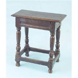 A 17th century style dark oak joint stool with moulded frieze and baluster turned underframe, old timbers £350-500