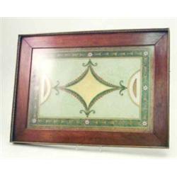 A 1920's mahogany and beadwork tray, rectangular with brass gallery inset with an Adam design in coloured beads, 23 ins. £80-120