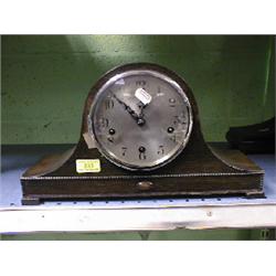 A 1930's oak Napolean's hat mantel clock with 8-day chiming movement.