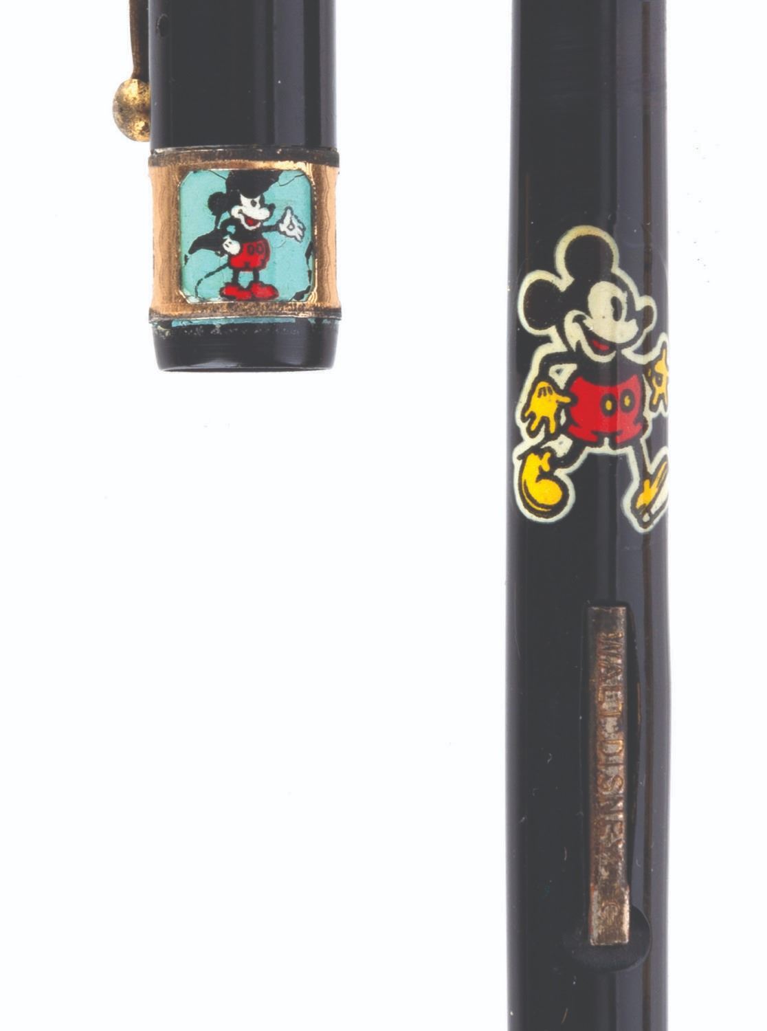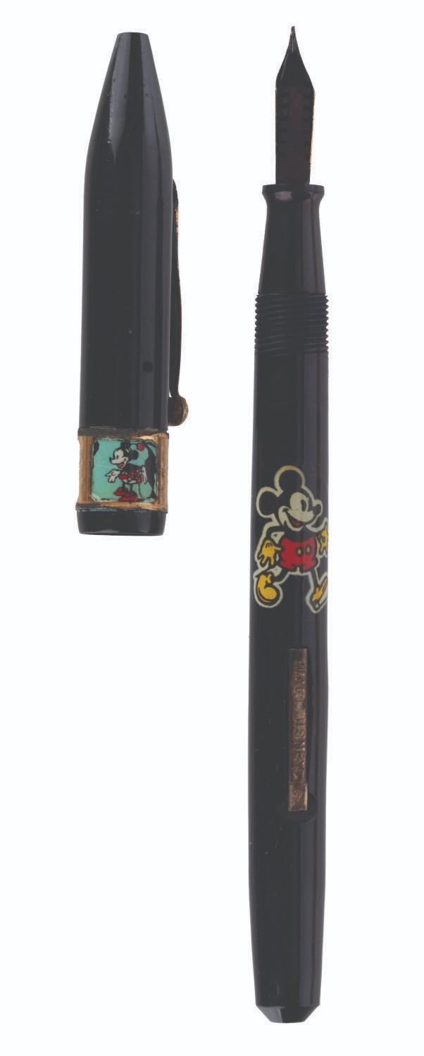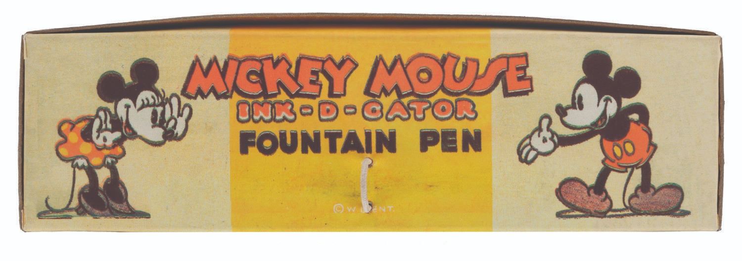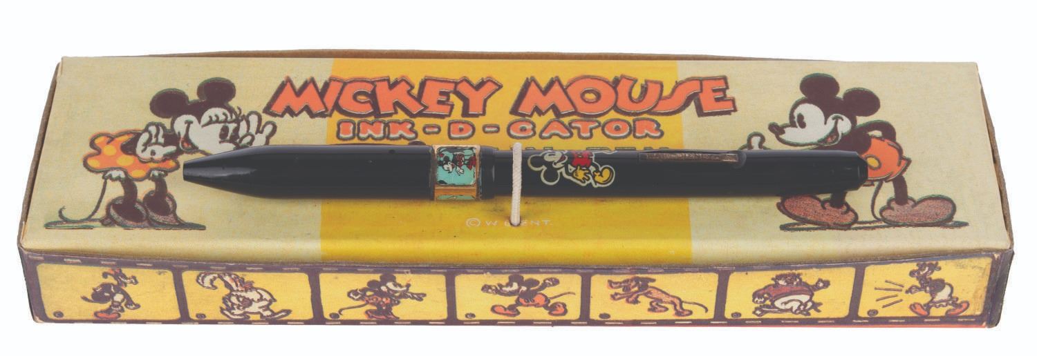 (Inkograph, 1930s) A Mickey Mouse Ink-D-Cator fountain pen manufactured by Inkograph. Measuring 5.25” long with a 2.5” x 7.75” x 1” tall reproduction of the original box, the pen is in good condition with scratches, scuffs, chipping, paint loss, wear, and oxidation from age.