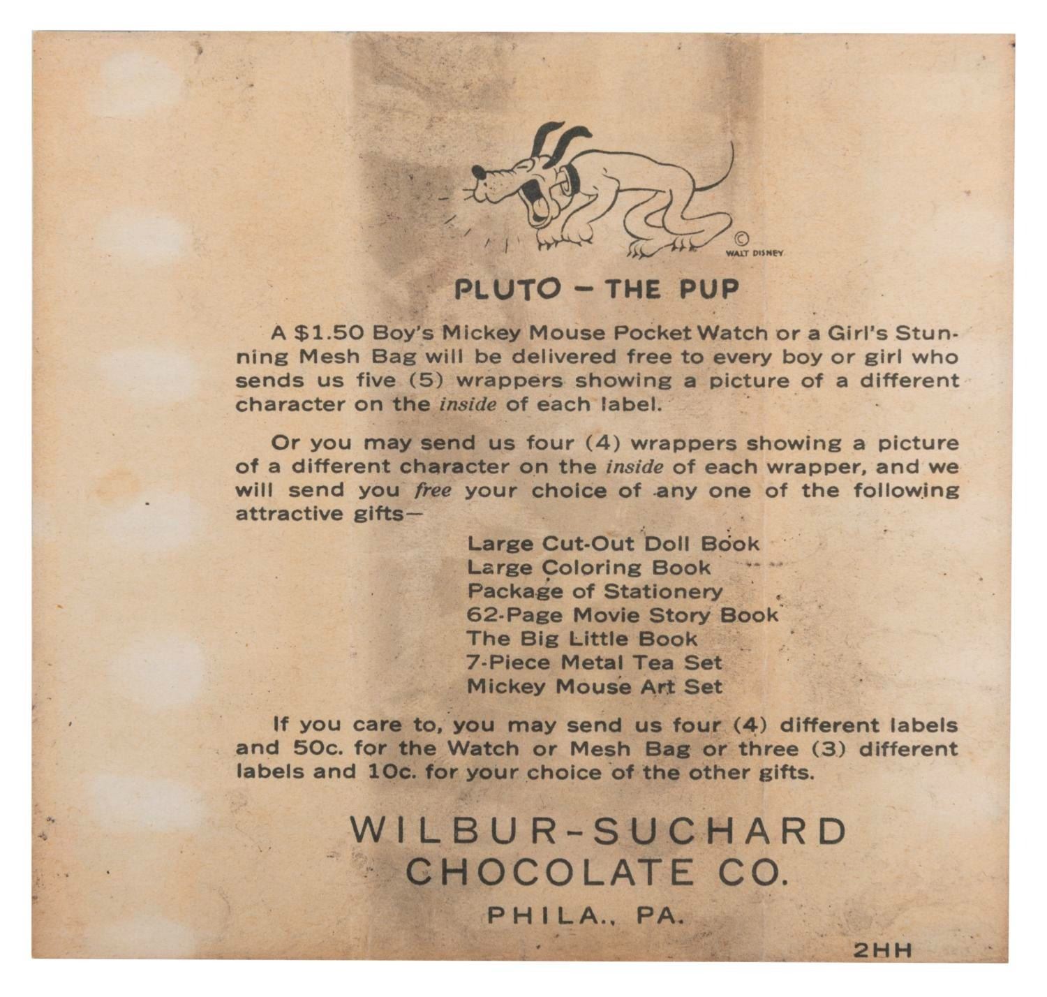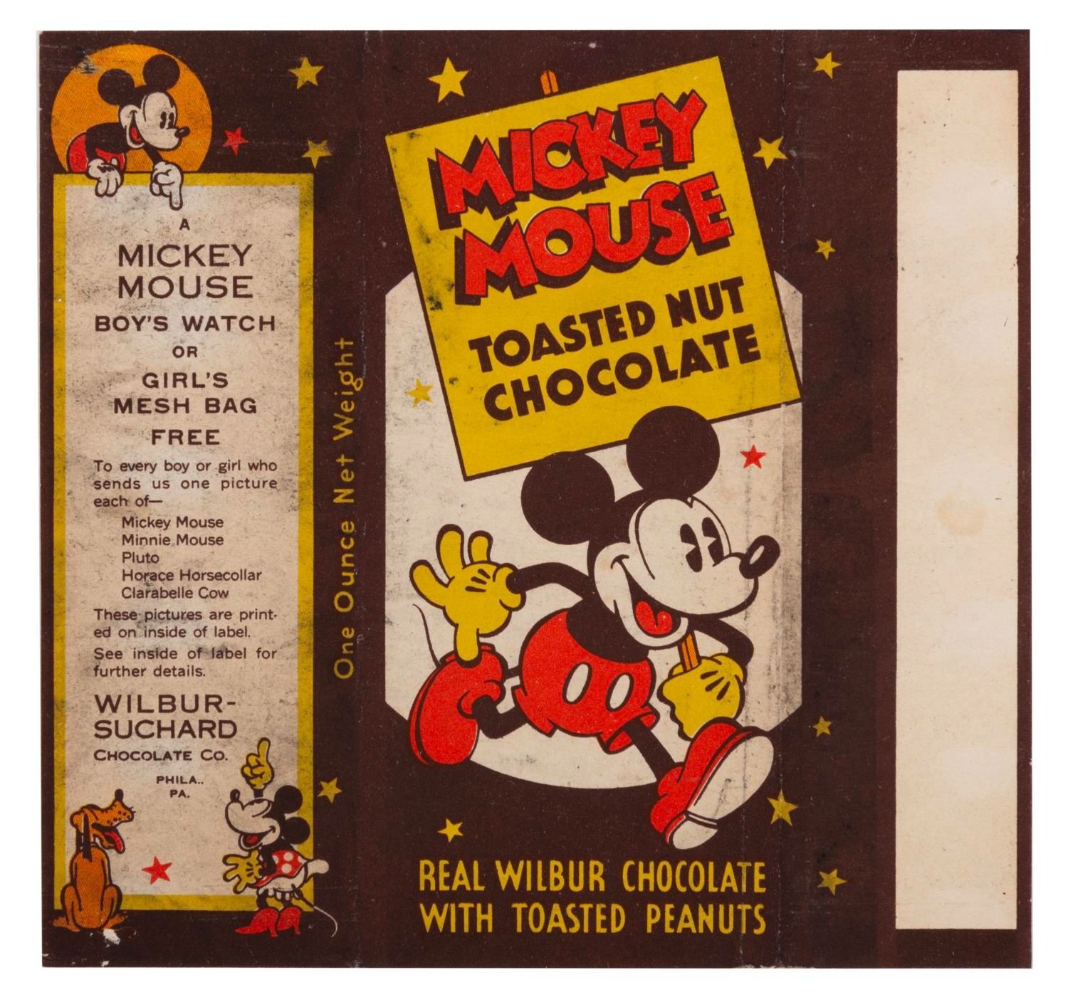 (Wilbur-Suchard, 1930s) A Mickey Mouse Toasted Nut Chocolate wrapper by the Wilbur-Suchard Chocolate Company of Philadelphia. The reverse features Clarabelle Cow and instructions on how to get a free Mickey Mouse Pocket Watch or Girl’s Stunning Mesh Bag. Measuring 4.5" x 4.5", the wrapper is in good condition, with scuffs and discoloration overall.