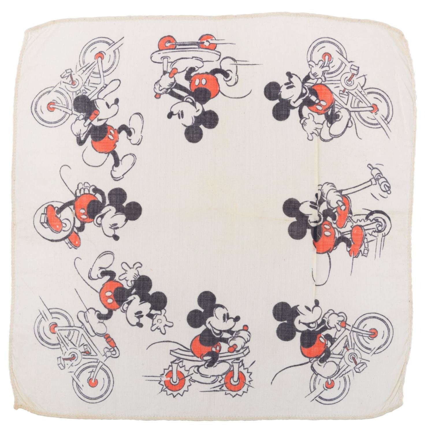 (Disney, 1930s) A child’s handkerchief featuring Mickey Mouse on bicycles. Measuring 8.5" x 9", the handkerchief is in very good condition with light wear from age and handling.