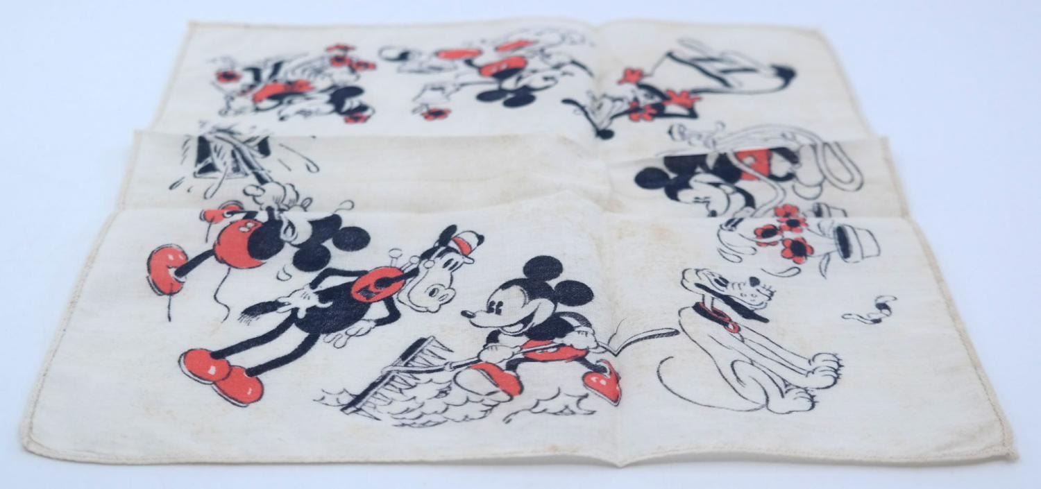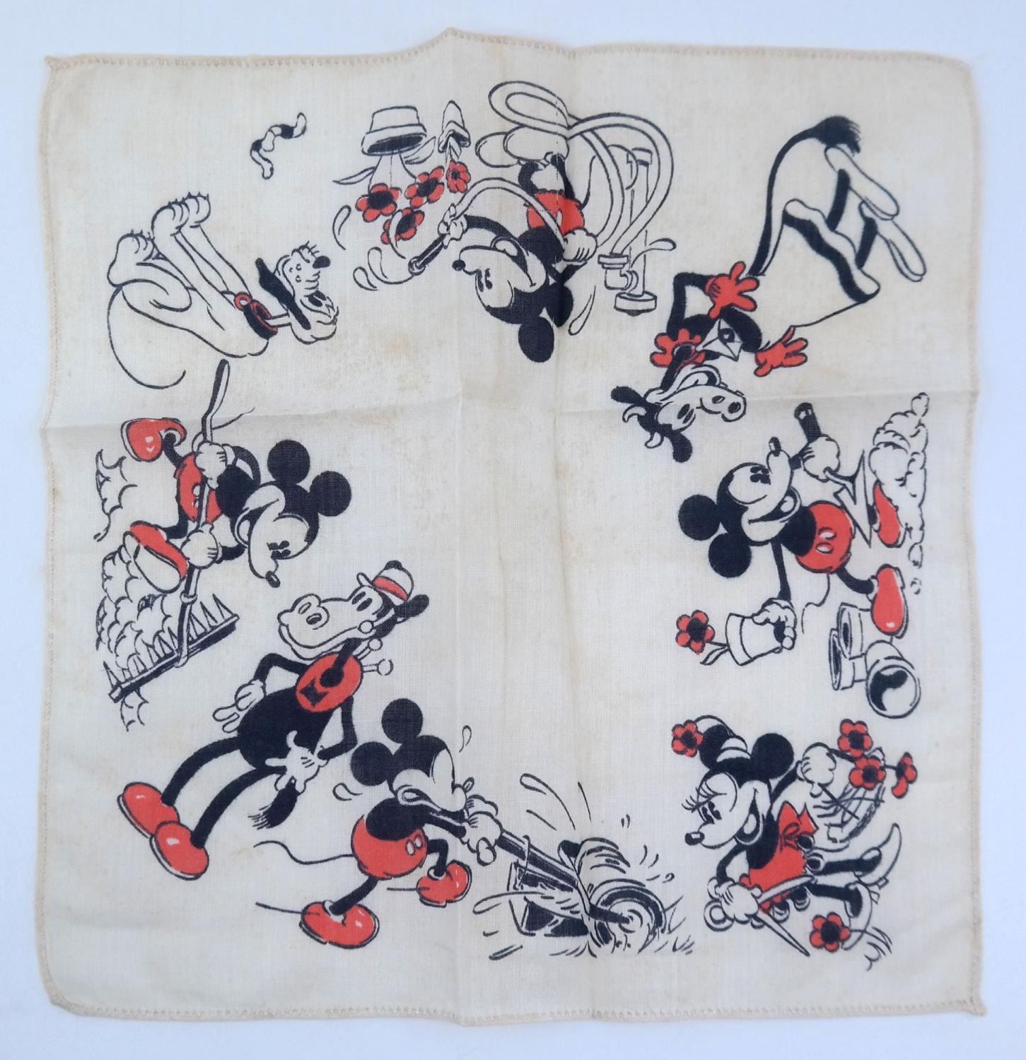 (Disney, 1930s) A Mickey and Friends handkerchief featuring early characters, including Horace Horsecollar and Clarabelle Cow. Measuring 8.25" x 8.75", the handkerchief is in very good condition with minor wear and slight discoloration from age and use.