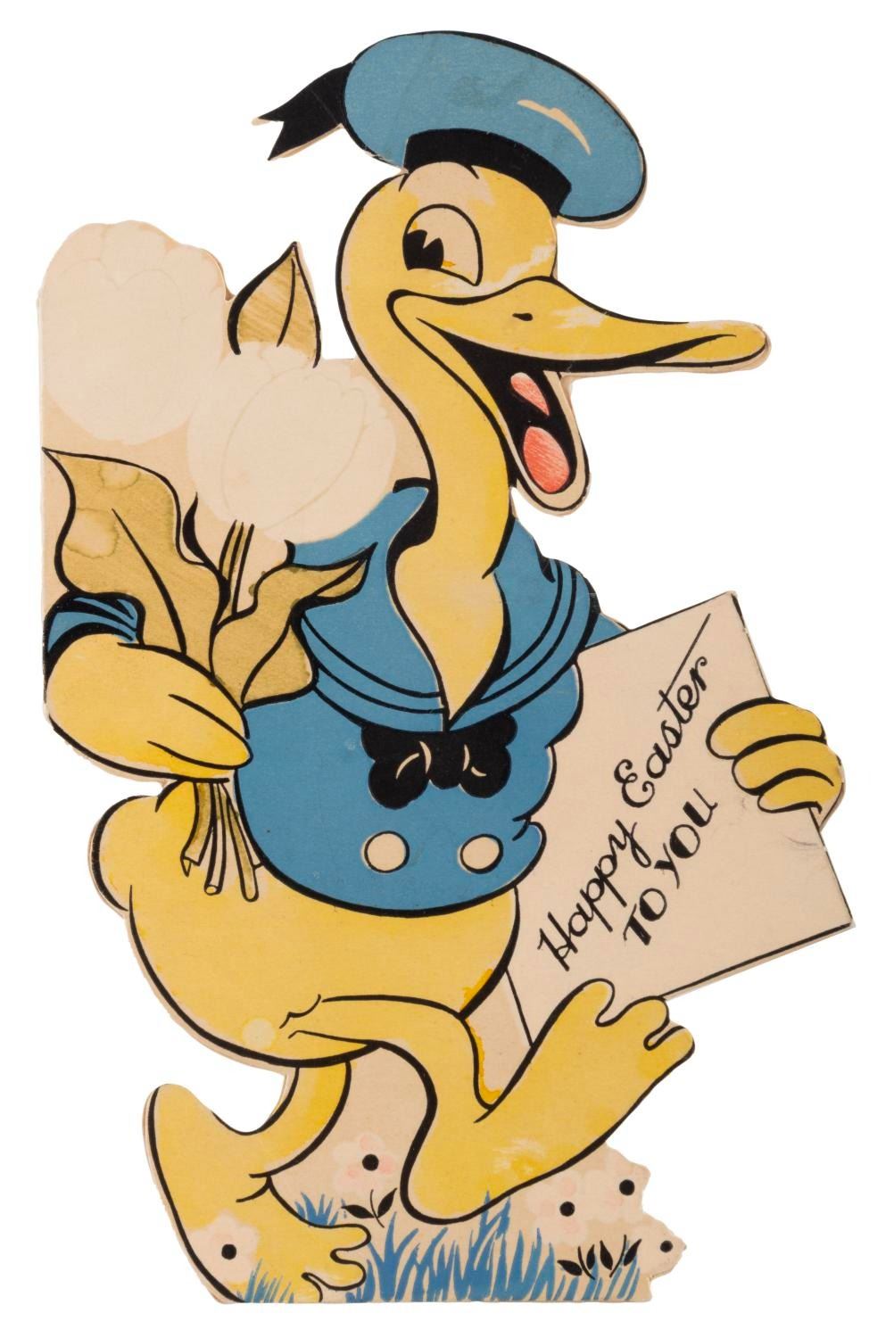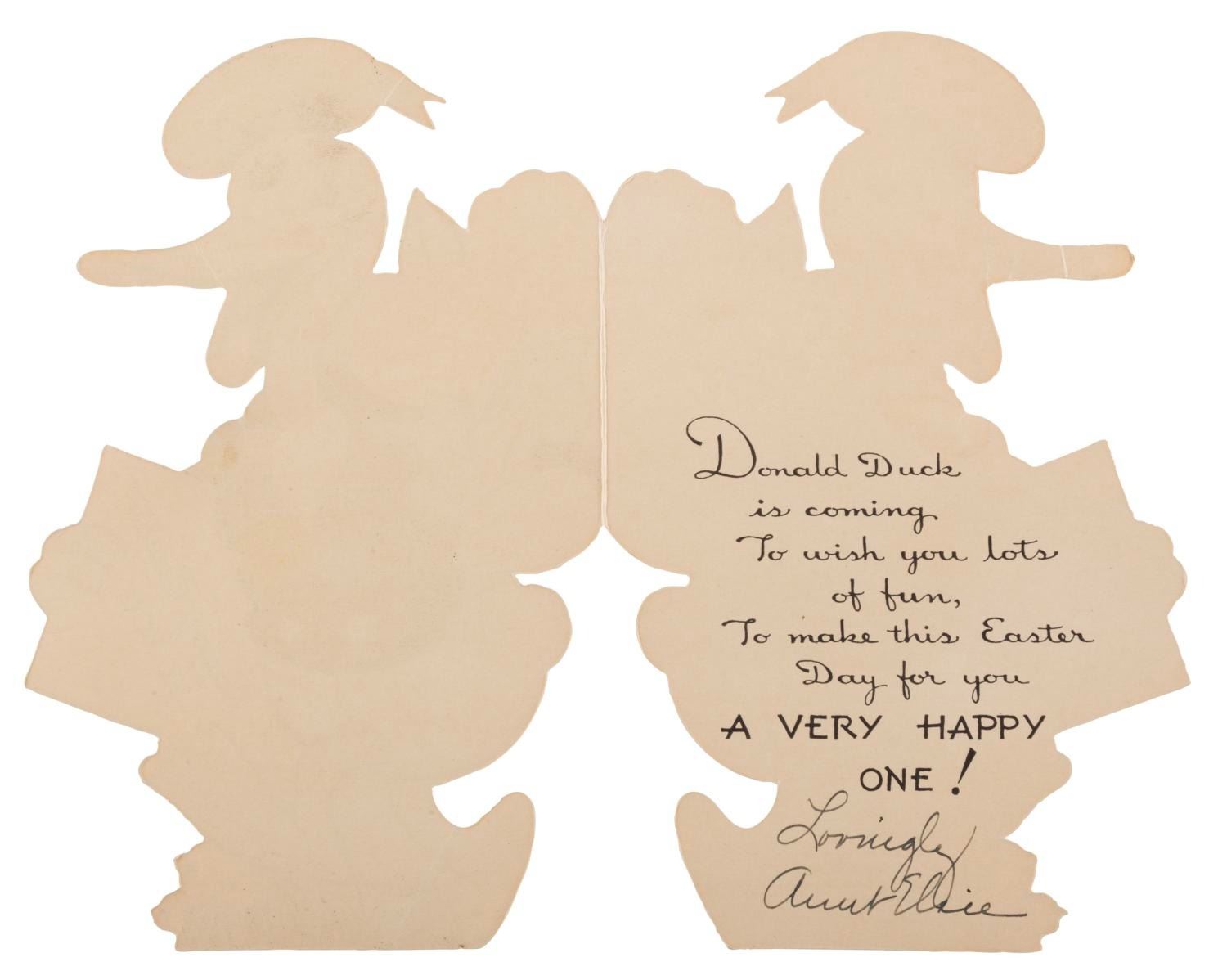 (Hallmark, 1936) A very early Donald Duck Easter card. Measuring 4.25" x 6.5", the card displays in good condition with fading from age, light paper retention and pencil marks on the back, and a dedication from Aunt Elsie inside.