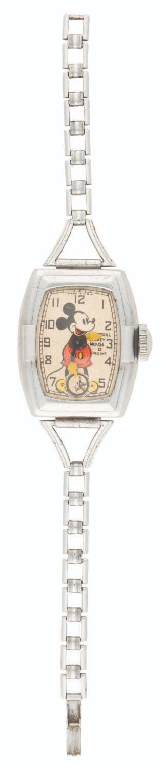 (Ingersoll, 1937) A 1937 Mickey Mouse wristwatch by Ingersoll. This design is more oblong than earlier versions and features one Mickey inside the smaller circle instead of three. Measuring 6.5” long with a 1” x 1.25” face, the watch displays in very good condition with scratches, wear, and discoloration from age; and requires service to function.