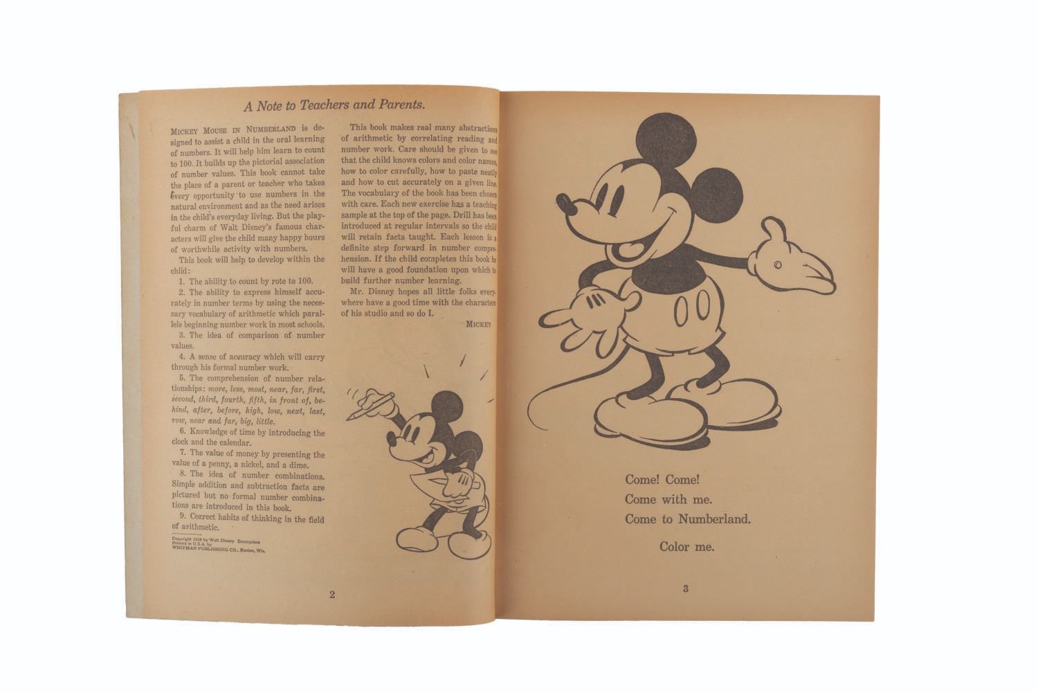 (Whitman, 1938) A Mickey Mouse in Numberland Coloring and Activity book. Measuring 8.25" x 11", the 96 page book is in very good condition for its age with no marks inside, very little cover wear, and interior pages browning from age as is typical.