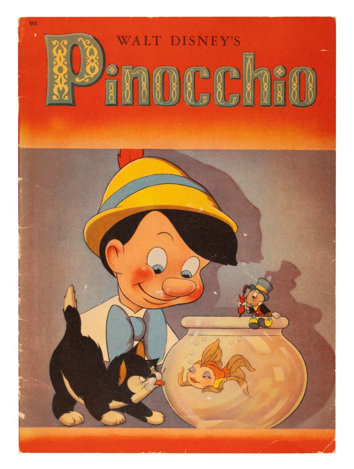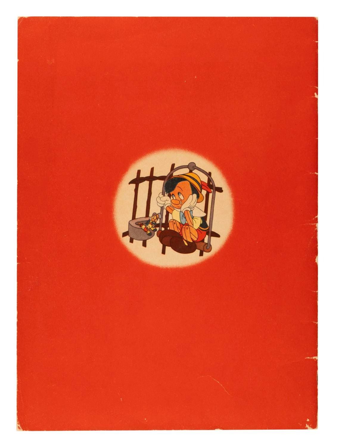 (Whitman, 1939) A copy of Walt Disney's "Pinocchio" book featuring the story of the film. Measuring 9.5" x 13", the book displays in good condition with edge wear, small scuffs to the cover, discoloration from age, and a 1.5" tear at the top of the spine.