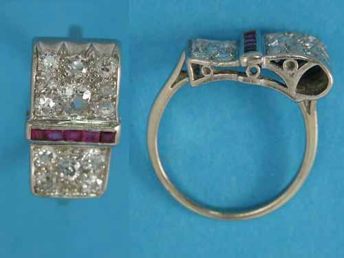 A 1940's cocktail ring, pave-set with diamonds and a line of calibre-cut rubies...