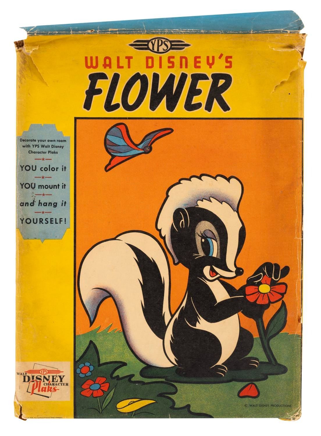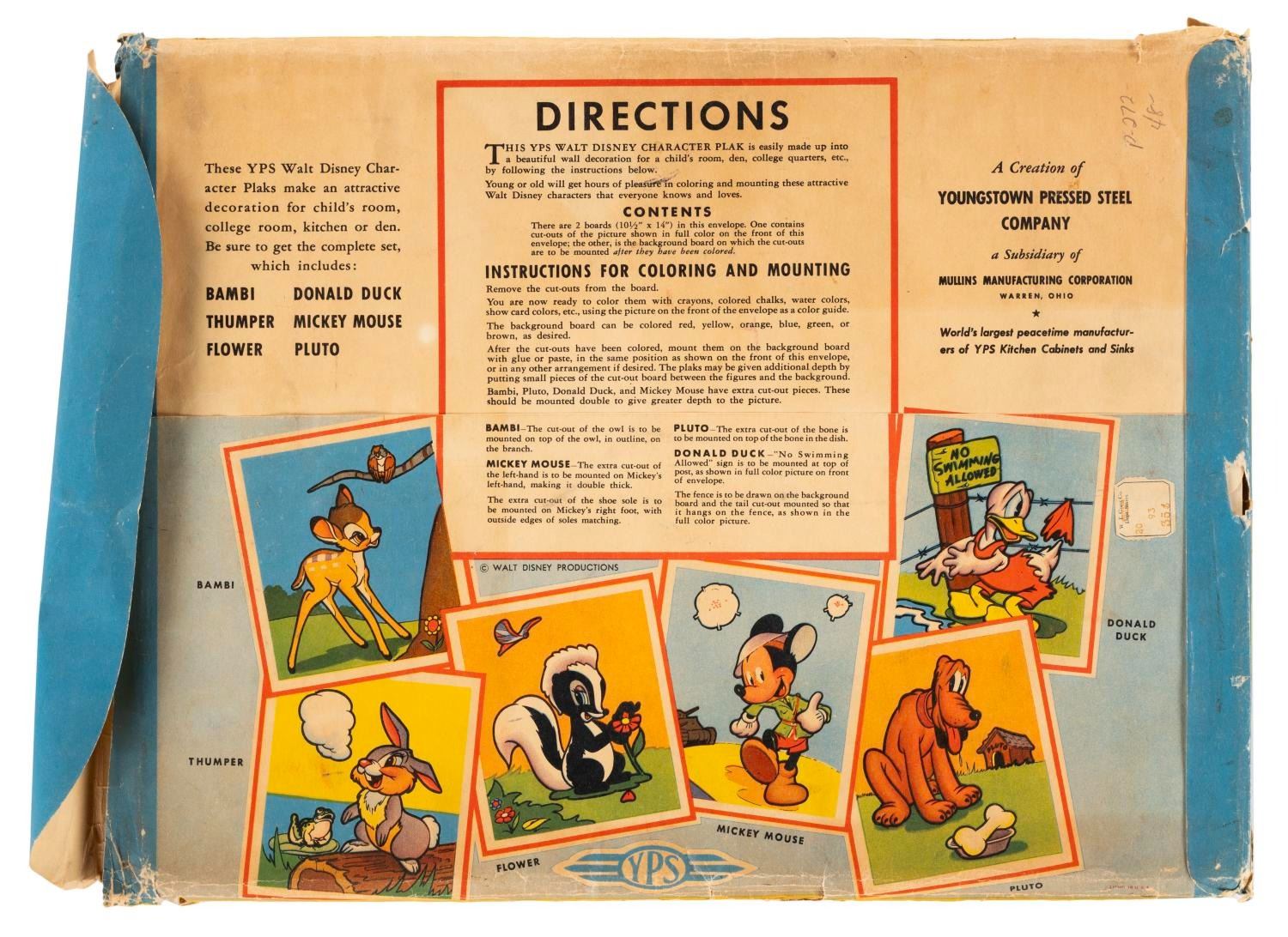(Youngstown Pressed Steel Company, 1942) A Walt Disney’s Flower Character Plak, colored in by a previous owner. Measuring 11” x 14”, the "Bambi" piece is in good condition with creases, discoloration from age, wear, and soiling at the top left corner.
