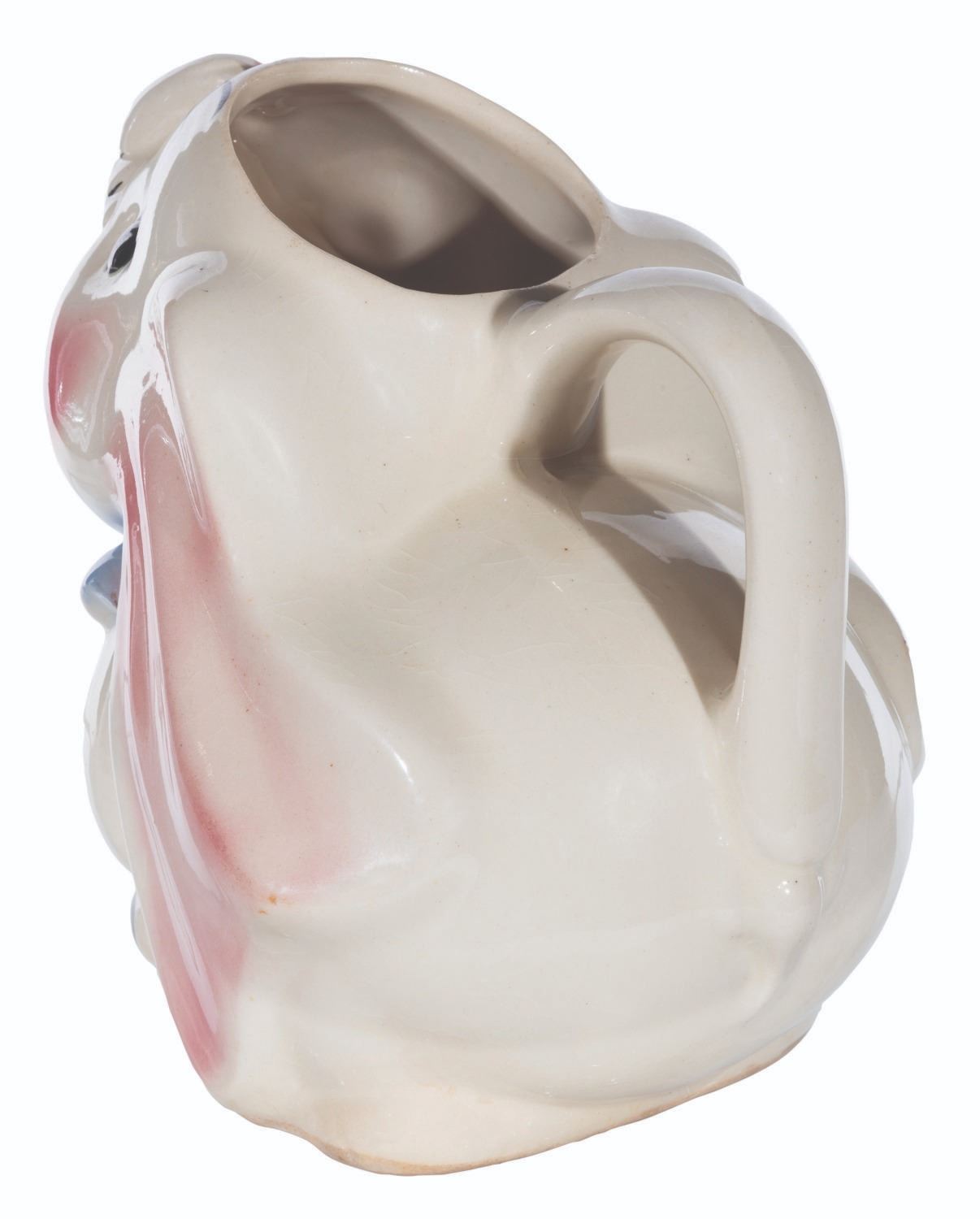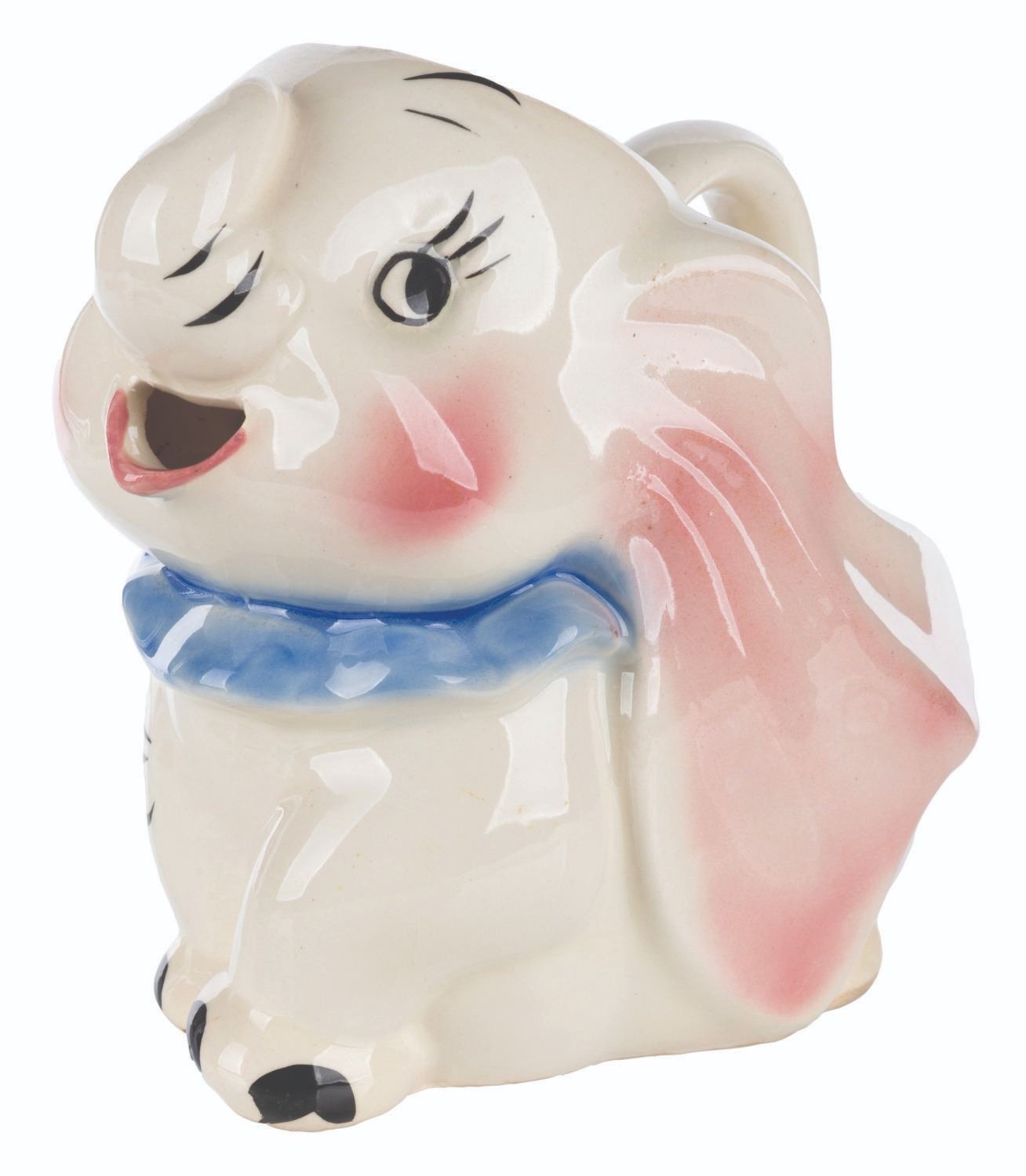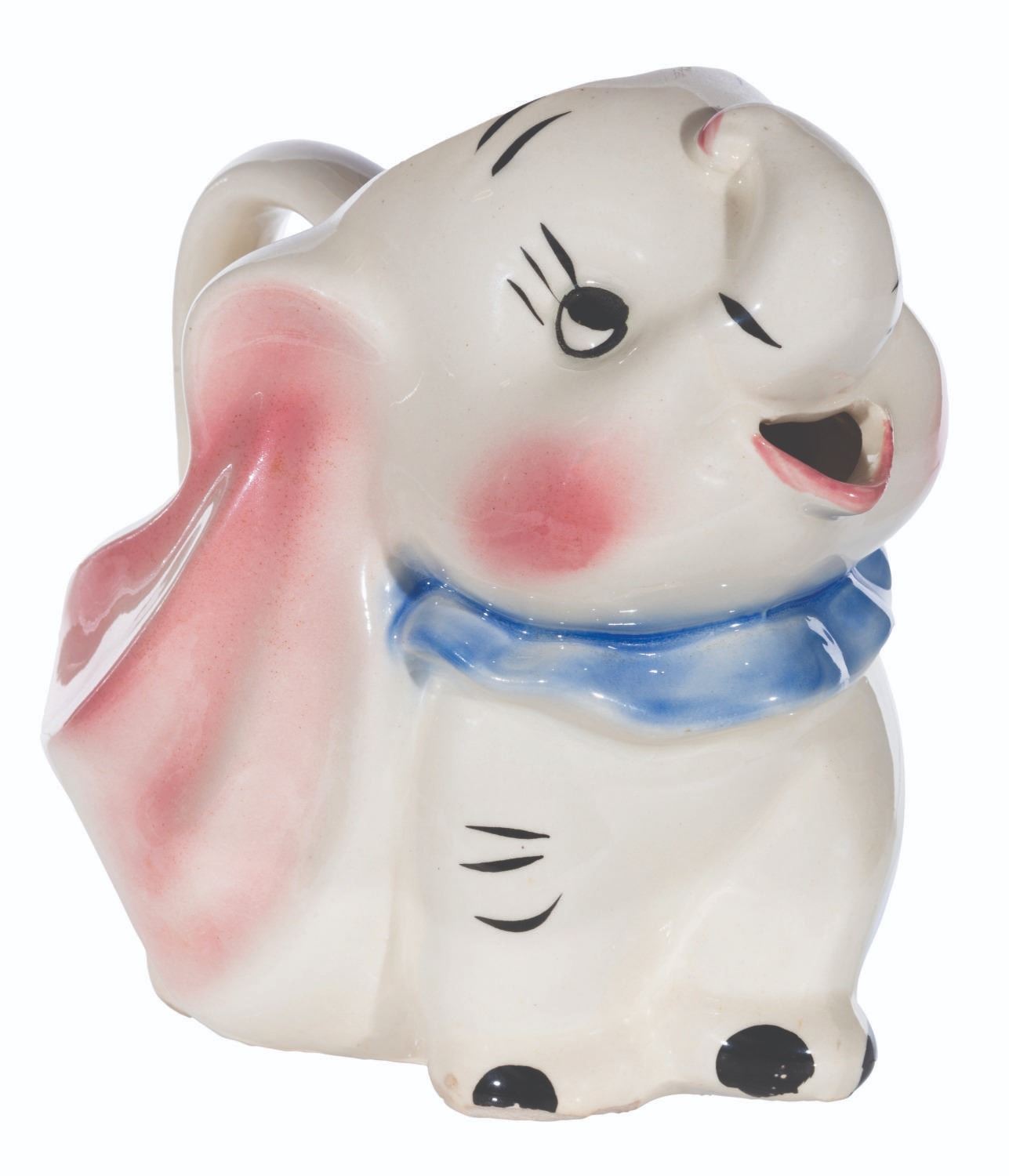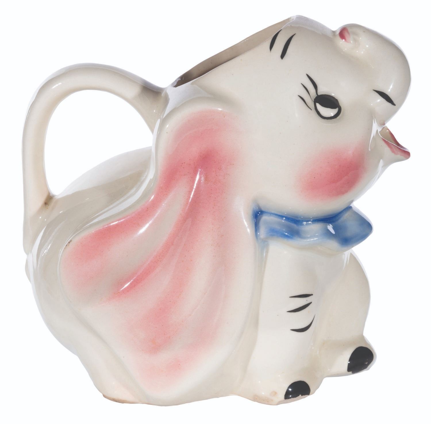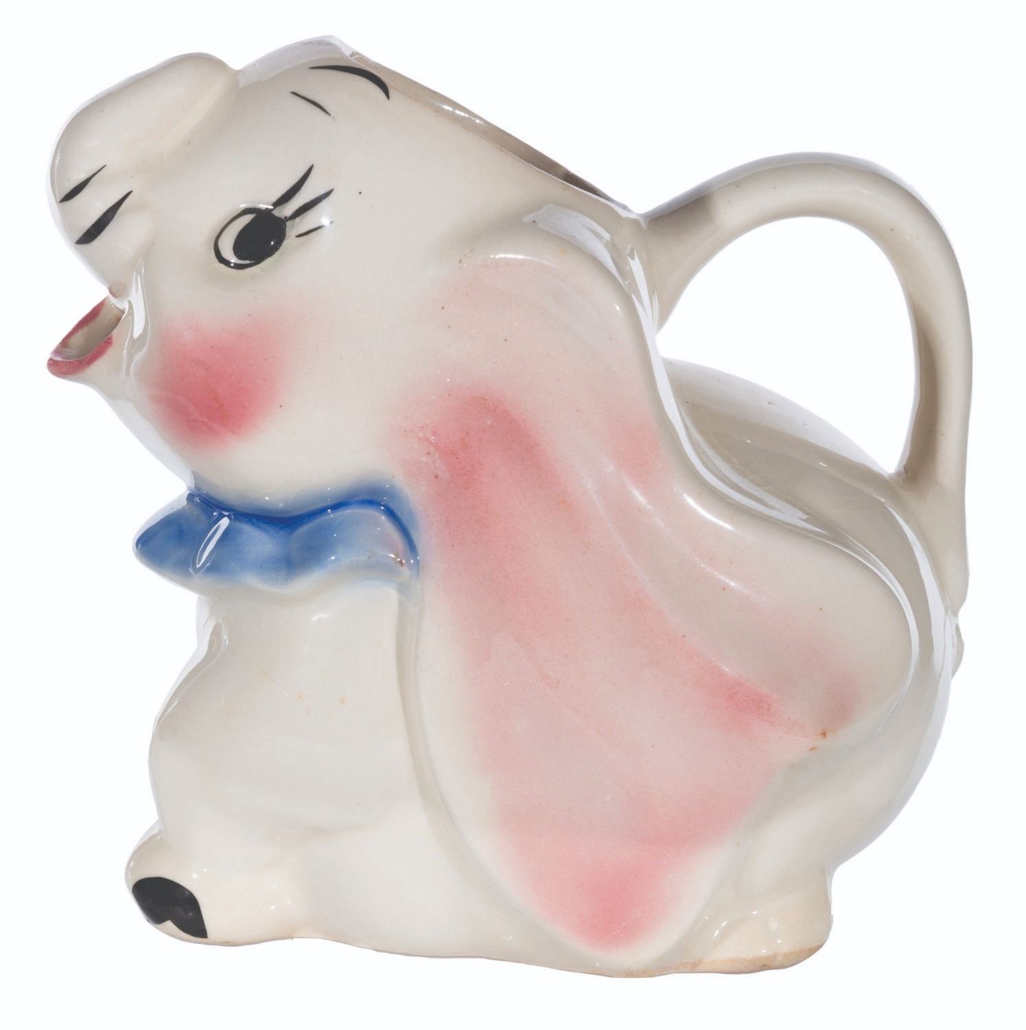 (Leeds China, 1940s) A ceramic pitcher inspired by the Disney animated classic"Dumbo." The heavy weight figural pitcher holds two quarts. Measuring 8" x 6.5" x 8" tall, the pitcher is in good condition with light wear from use, including a tiny chip in the rim and crazing.