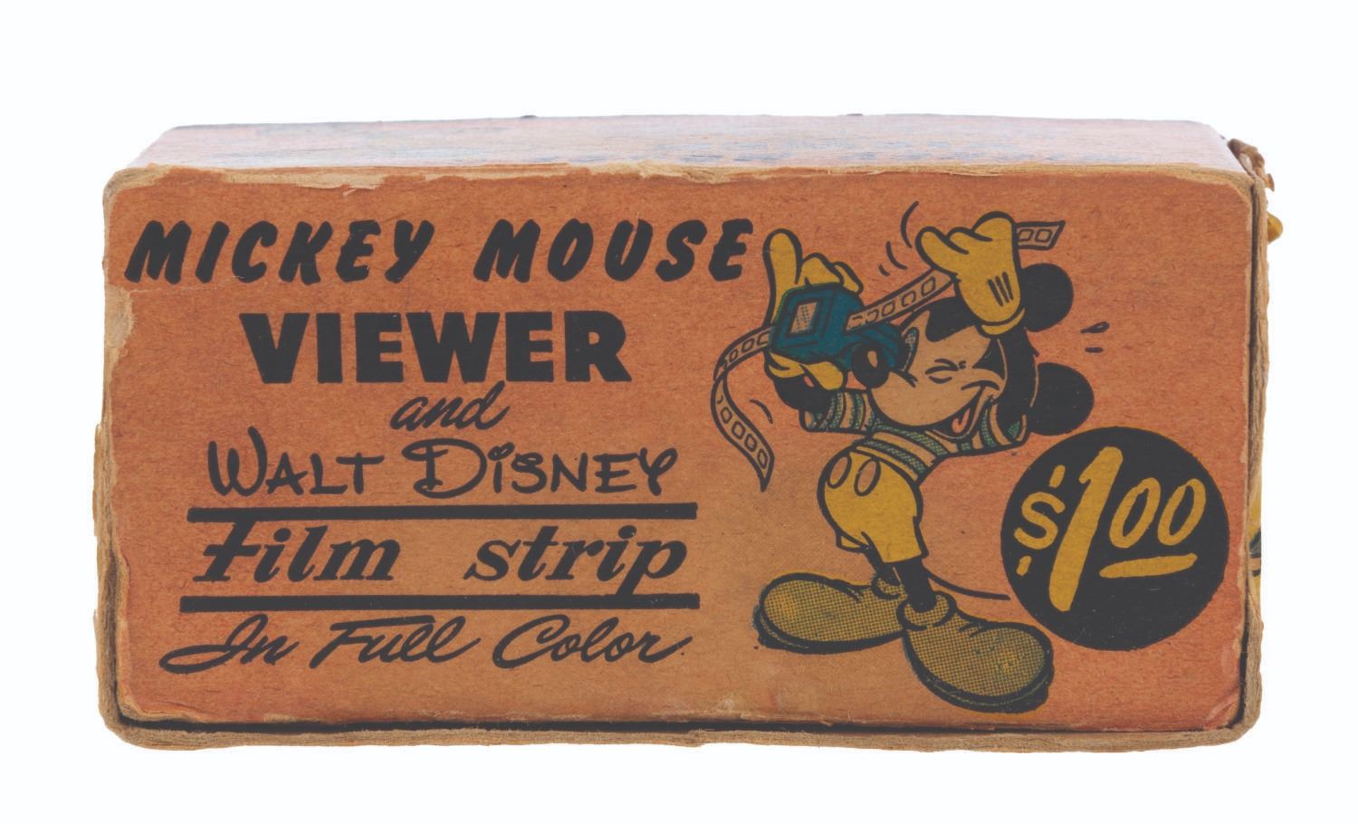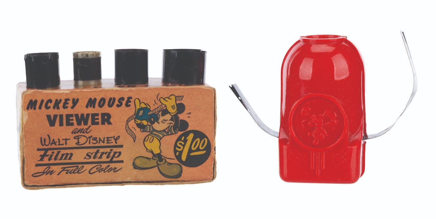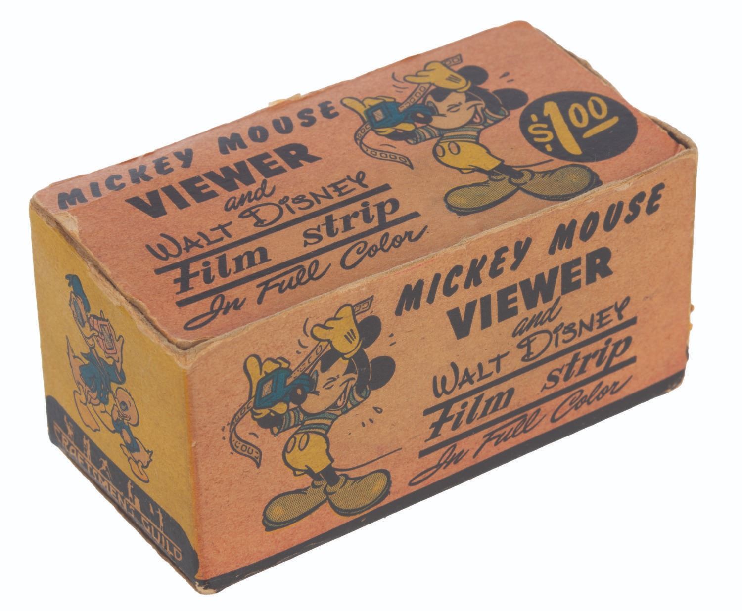 (Craftsman Guild, 1940s) A Mickey Mouse Viewer and Walt Disney Film Strip in Full Color with the original box, manufactured by Craftsman Guild. The viewer comes with 16 mm reels for “Brave Little Tailor,” “The Golden Touch,” a Three Little Pigs short, and two non-Disney reels, which were not included in the original set. Measuring 1.5” x 1.5” x 3” tall with it 2” x 3.75” x 2” box, the viewer and reels are in good condition with scratches, stains, and wear, notably on the Three Little Pigs reel.