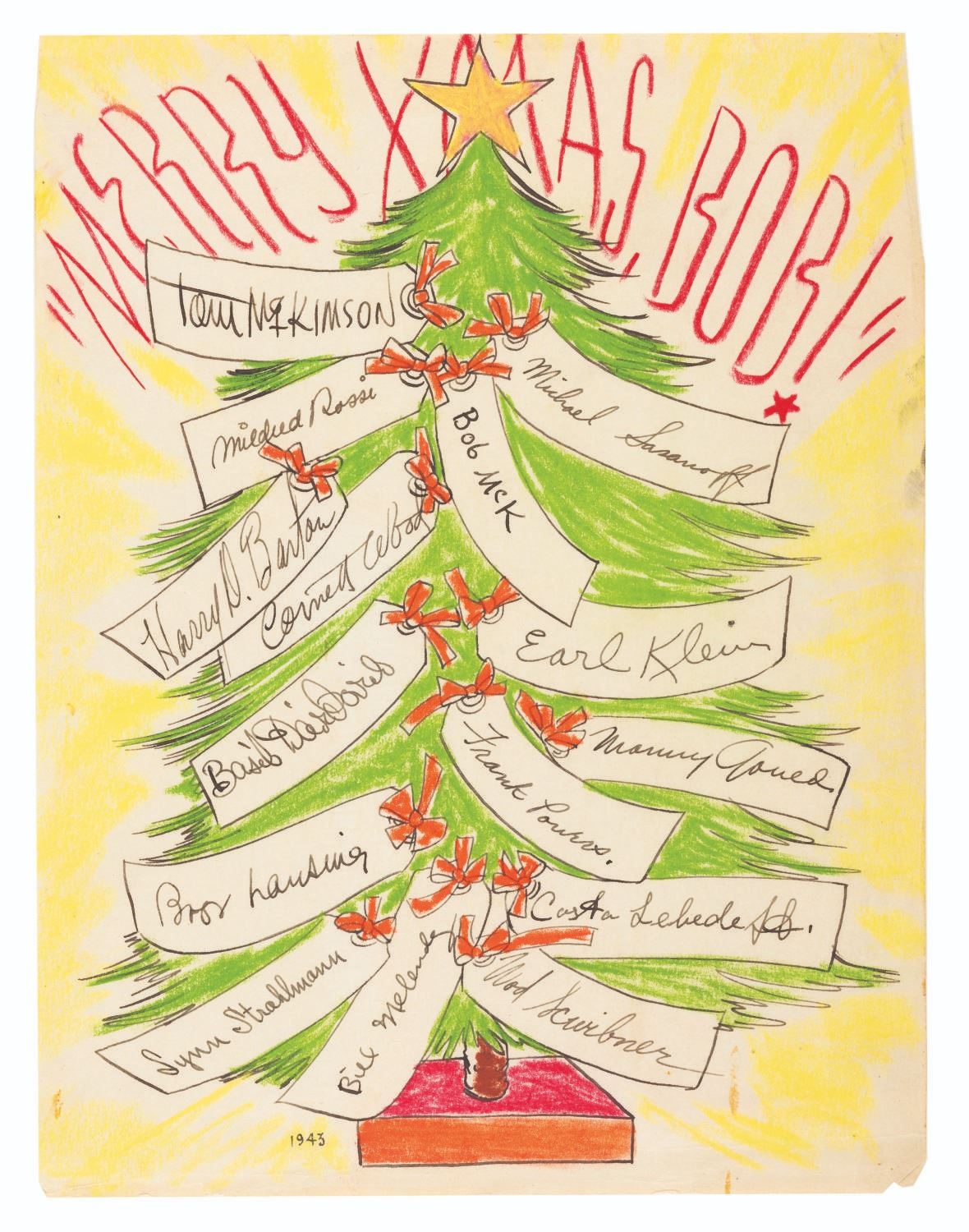 (Schlesinger, 1943) A hand-drawn Christmas card to Bob Clampett, signed by 15 of his colleagues at Leon Schlesinger Productions. Signatures include Bill Melendez, who later produced Peanuts animated specials for television, and brothers Tom and Bob McKimson. Measuring 8.25” x 11”, the card accomplished in ink and crayon is in very good condition, with light handling wear, age wear, and a few small spots.