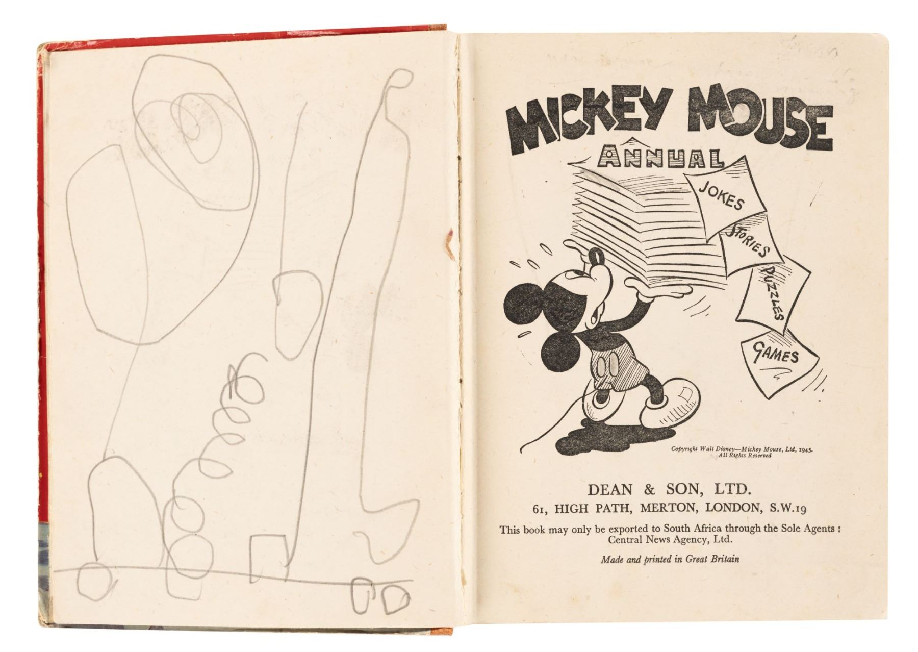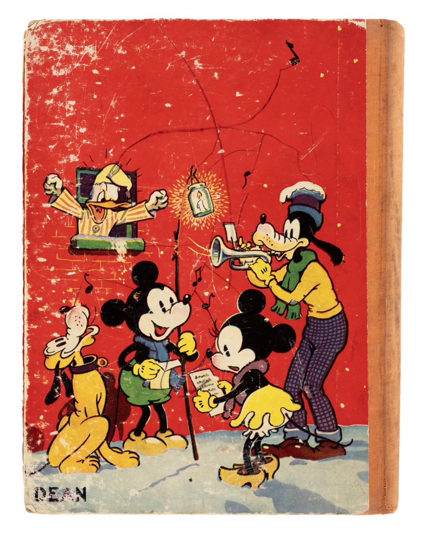 (Dean, 1945) A hardcover Mickey Mouse Annual from 1945. Comprised of comics, stories, and activities featuring Mickey and his friends, the first run of these anthologies were published in England every year from 1931-65. Measuring 6.5” x 8.75”, the book is in fair condition with heavy wear, scratches, pencil drawings and marks throughout, tears, missing pages, and coloring from use.