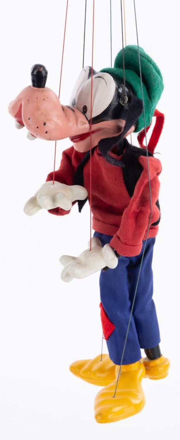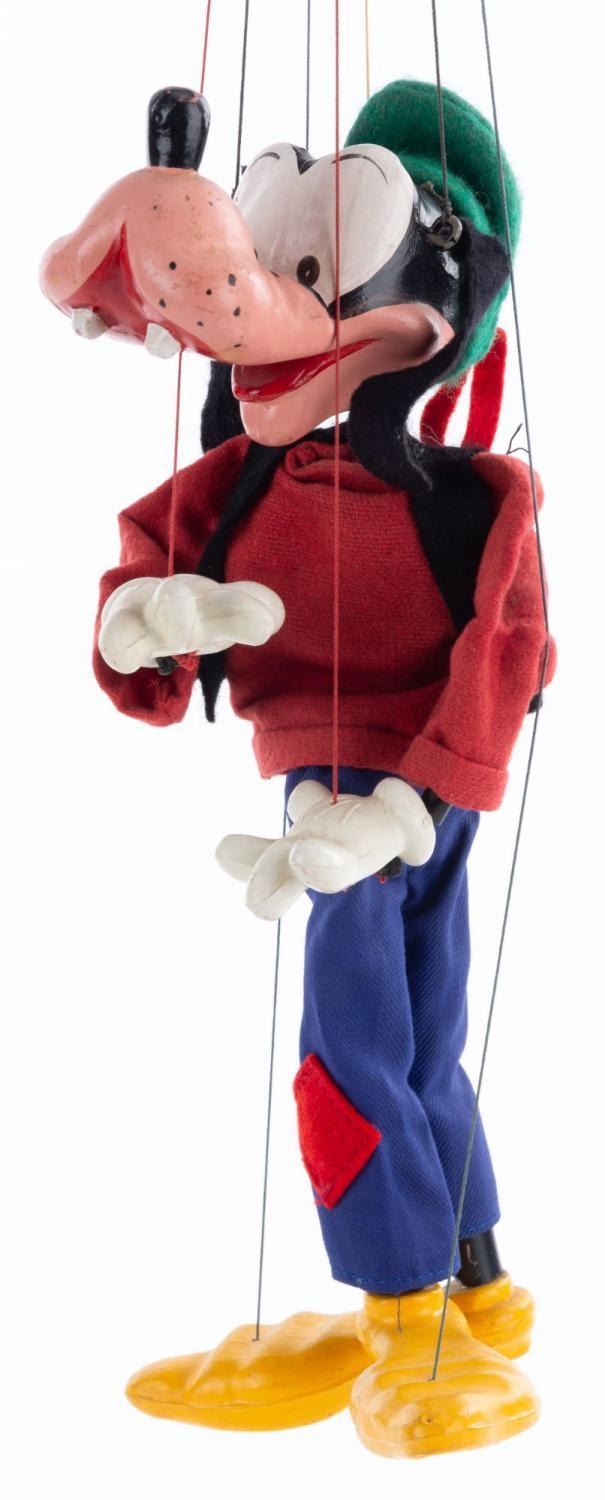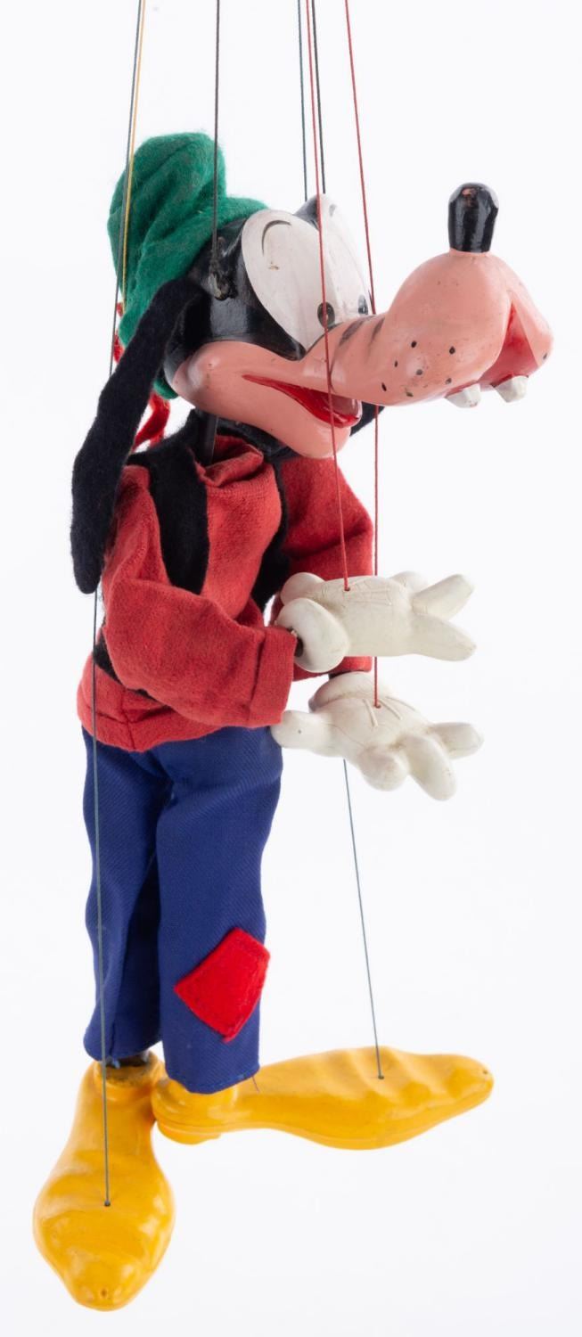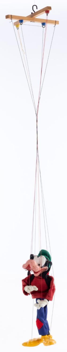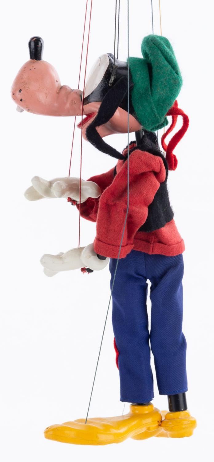 (Pelham Puppets, 1950s) An original Goofy marionette puppet composed of painted wood, with fabric clothing. Measuring 5" x 4" and 10" tall (not including strings and controller), the puppet is in good condition with slight discoloration to the paint and fabric elements from age, slight paint loss and scuffing, and cracking to the paint around the hands. The string elements are intact.