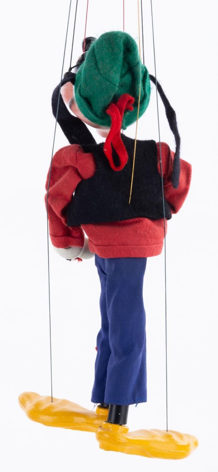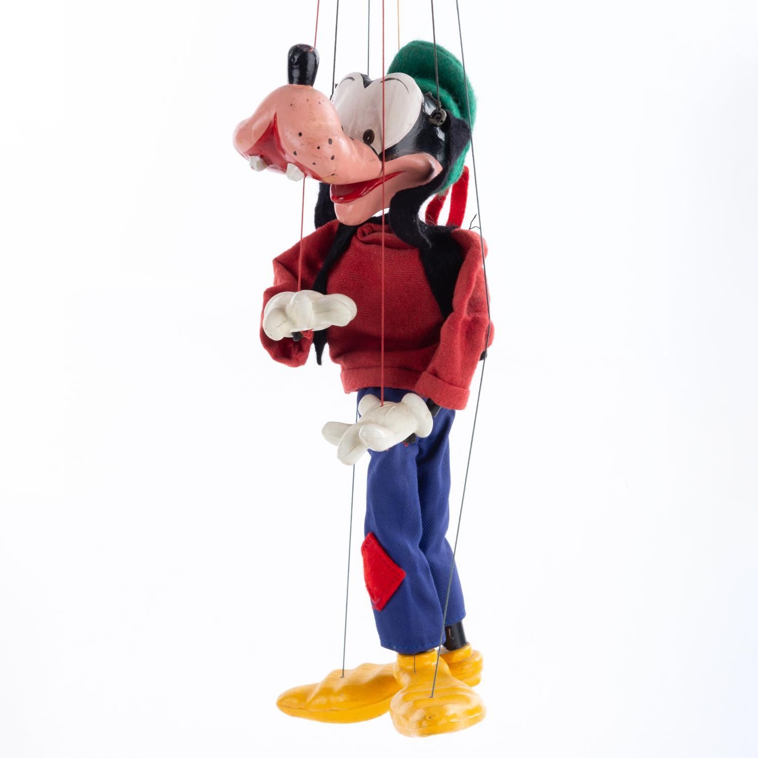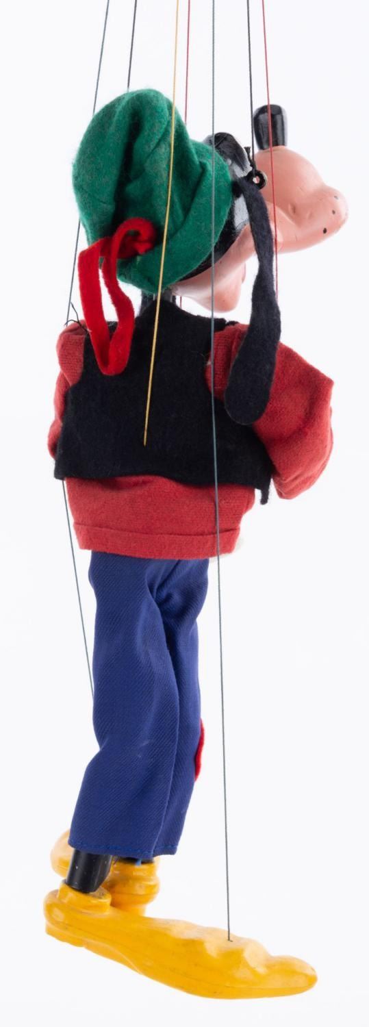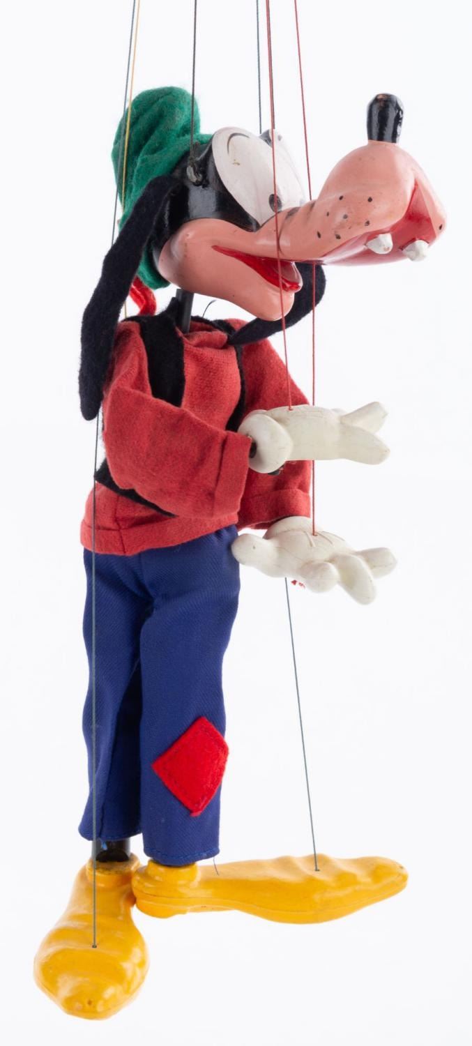 (Pelham Puppets, 1950s) An original Goofy marionette puppet composed of painted wood, with fabric clothing. Measuring 5" x 4" and 10" tall (not including strings and controller), the puppet is in good condition with slight discoloration to the paint and fabric elements from age, slight paint loss and scuffing, and cracking to the paint around the hands. The string elements are intact.