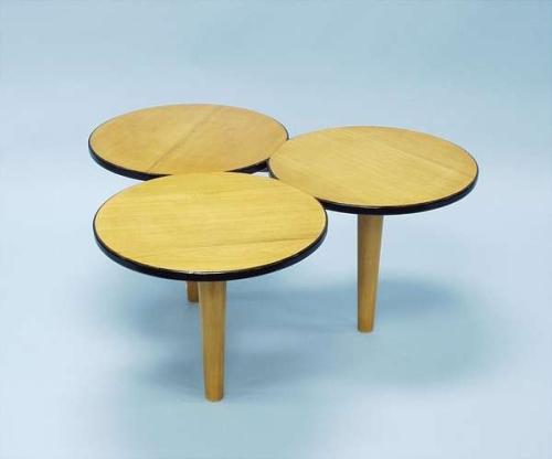 A 1950's fruitwood coffee table. The top is made up of three identical circular discs raised on three turned and tapered legs. 35" x 35", 16" high. 1500-1800