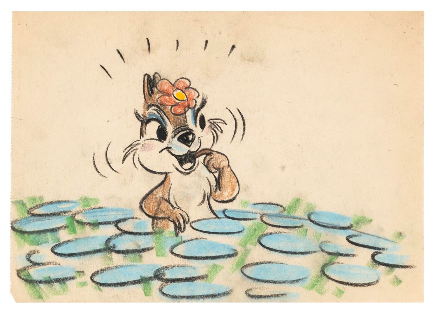 (Disney, 1950s) A storyboard of Clarice the chipmunk from the 1950s. Clarice first appeared in the animated short “Two Chips and a Miss,” driving Chip ‘n’ Dale wild and pitting them against each other. The art is accomplished in graphite and colored pencils. Measuring 6” x 8.5”, the storyboard is in very good condition with light smudges and the bottom left corner missing.