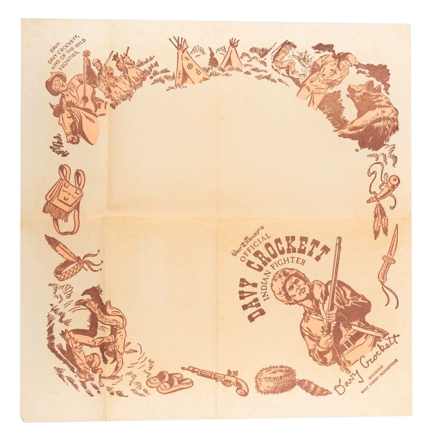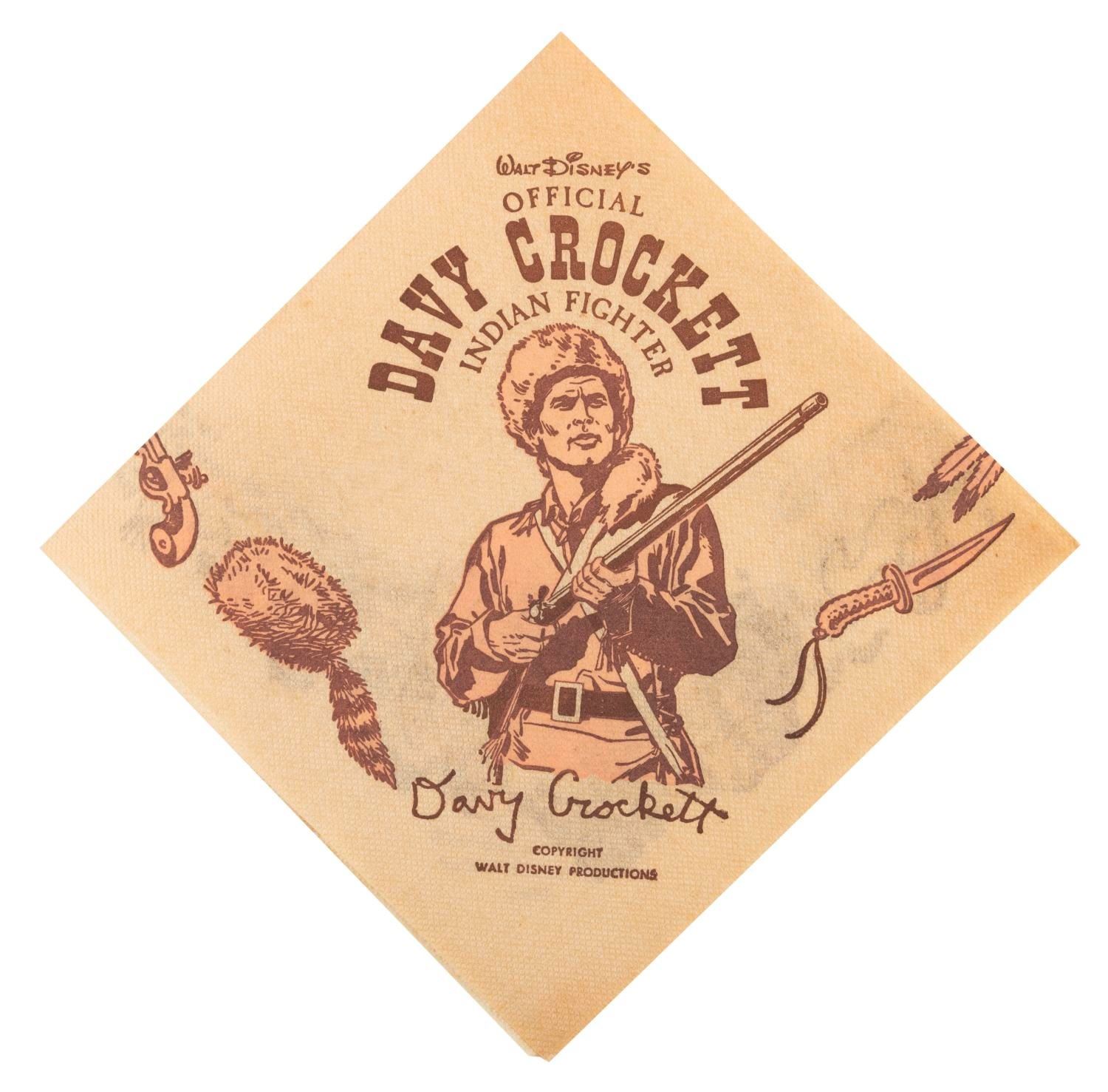 (Disney, 1950s) A Walt Disney’s Official Davy Crockett Indian Fighter paper napkin, featuring frontier icons and an image of Fess Parker as Crockett. The napkin is in very good condition with a fold in one side from storage.