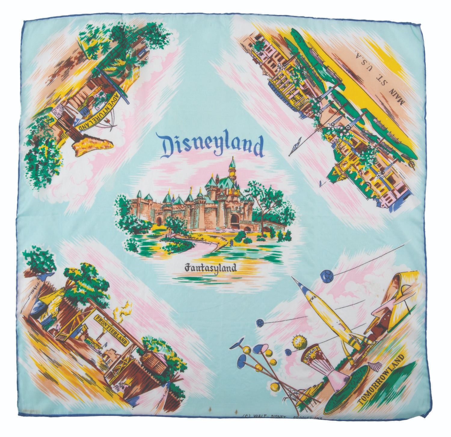 (Disneyland, 1950s) An early Disneyland silk scarf with colorful imagery from each of the Park’s original five lands. Measuring 17” x 16.5” the scarf is in very good condition with vibrant colors, and a few small spots from age.