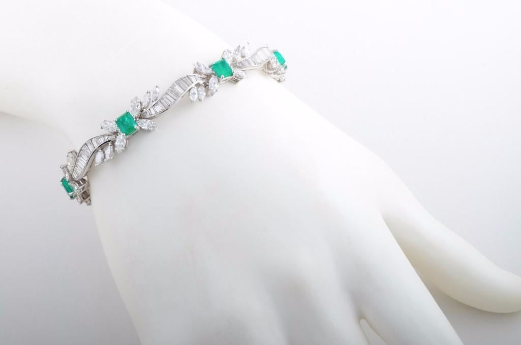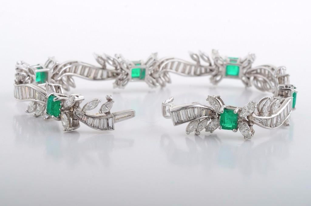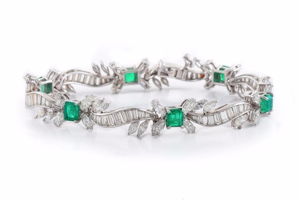 Arranged in a sectional pattern with afloral design, having 6 rectangular emeralds, weighing a total of approximately 3.48 carats, and 48 marquise-cut diamonds, weighing a total of approximately 5 carats; set in platinum; length 7 inches; weight 30.6g.