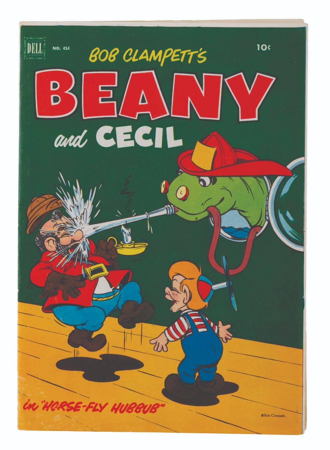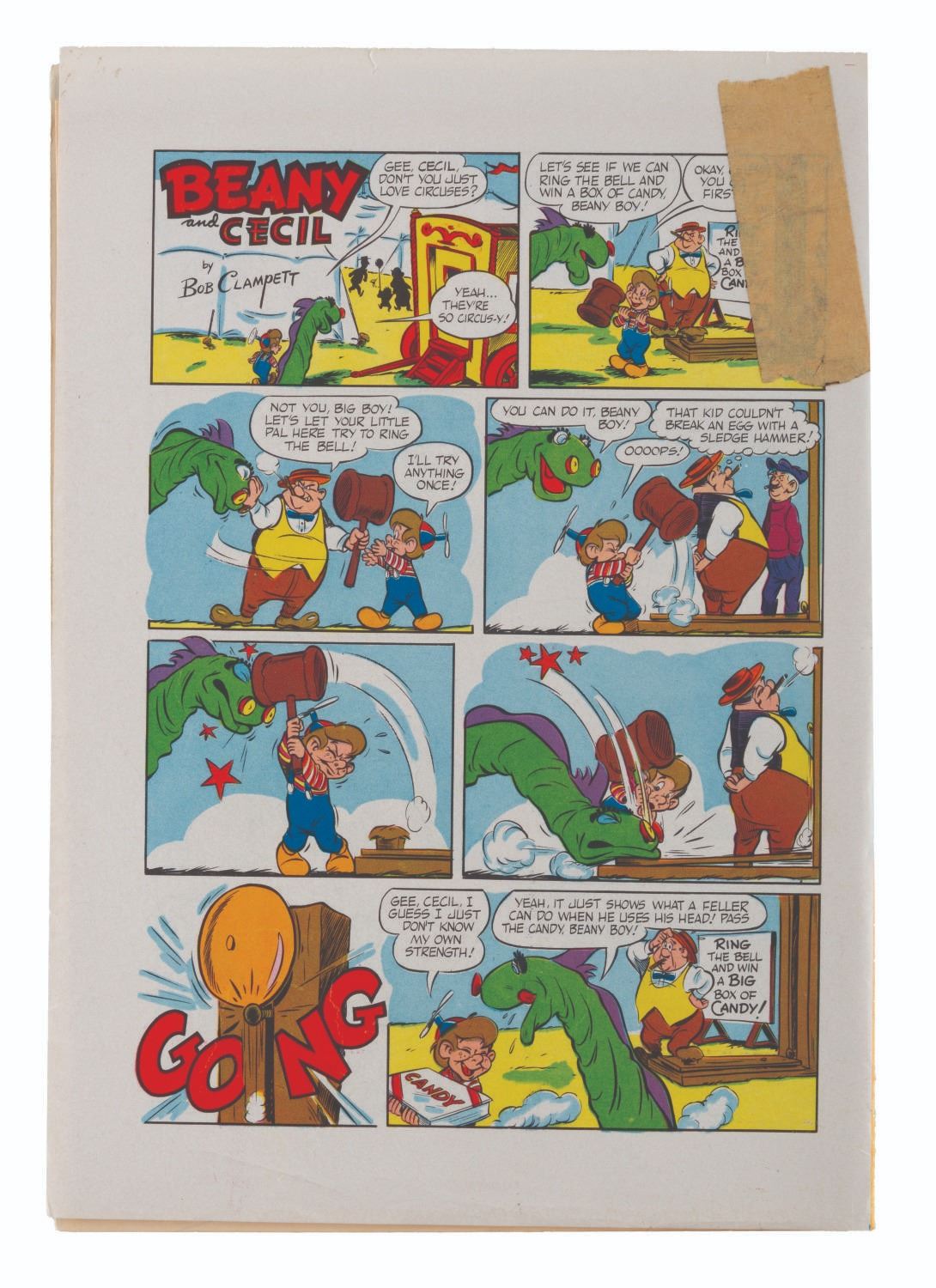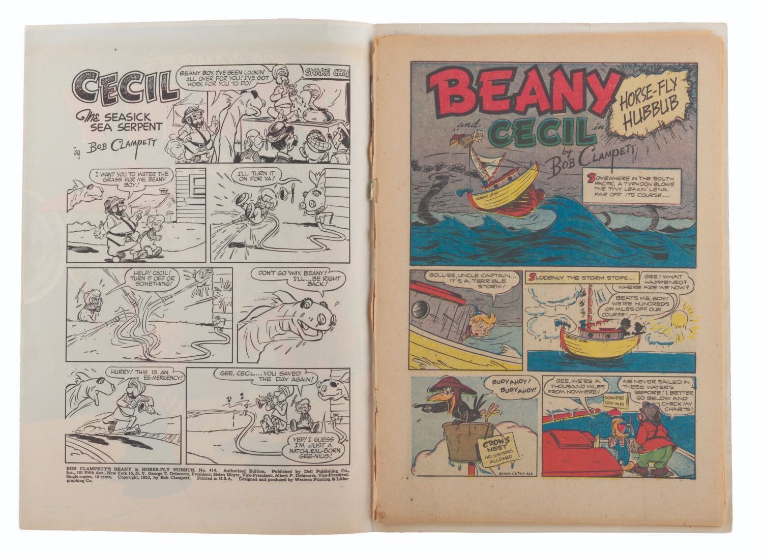 (Dell, 1952) A pre-production sample of Dell Four Color #414, the first comic book released with the title “Beany and Cecil.” Issue 368 in 1952 was the first comic to feature the characters, and was titled “Bob Clampett’s Beany.” This book, most likely an early print sample, has an untrimmed cover with no staple holes, with the full coverless comic inside. Measuring 7.5” x 10.25”, the comic book displays in good condition, with edge wear to the cover, a 3” piece of masking tape on the back, and the first two inner pages loose from age, with some chipping to the edges.