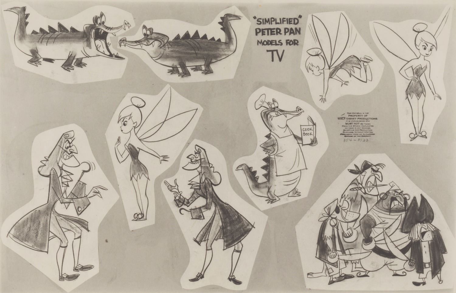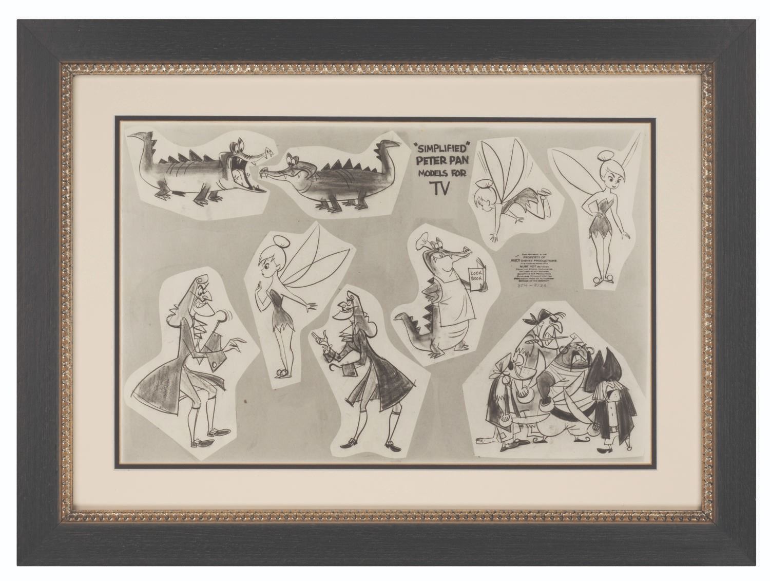 (Disney, 1954) An over-sized photostat model sheet of “Peter Pan" characters in simplified styles designed specifically for early Peter Pan peanut butter commercials. Model sheets like these were used by animators to ensure consistent character design in a production. The model sheet measuring 11" x 17" is in very good production-used condition with a vertical crease through the center, and presented in a 17.25" x 23.25" frame.