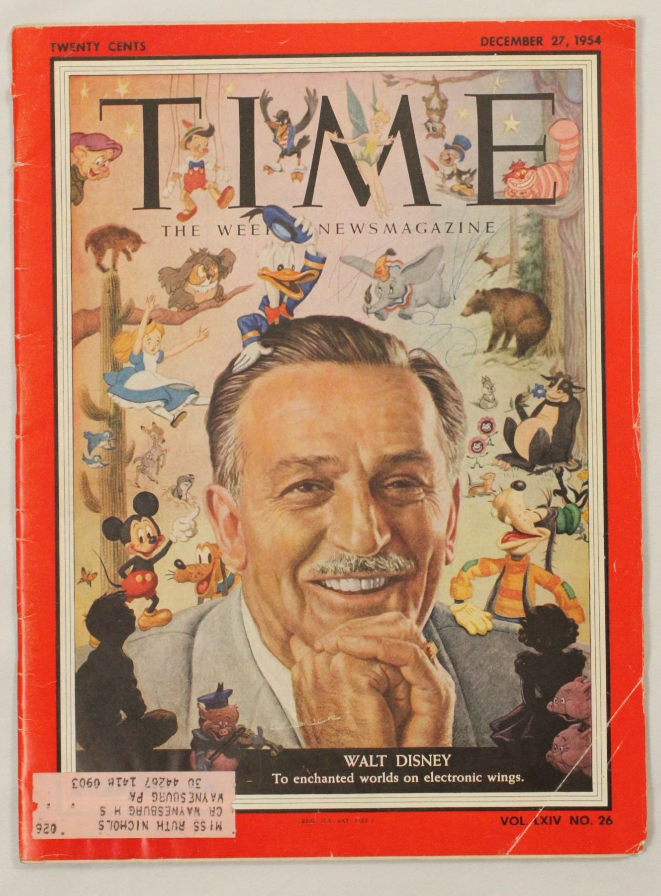 (Time Magazine, 1954) Walt Disney and his cast of characters dominate the cover of this 1954 Time Magazine Volume 64, Number 26. The magazine is in good condition with some creases, corner bends and edge wear from use. The cover does have some ink marks around Dumbo.