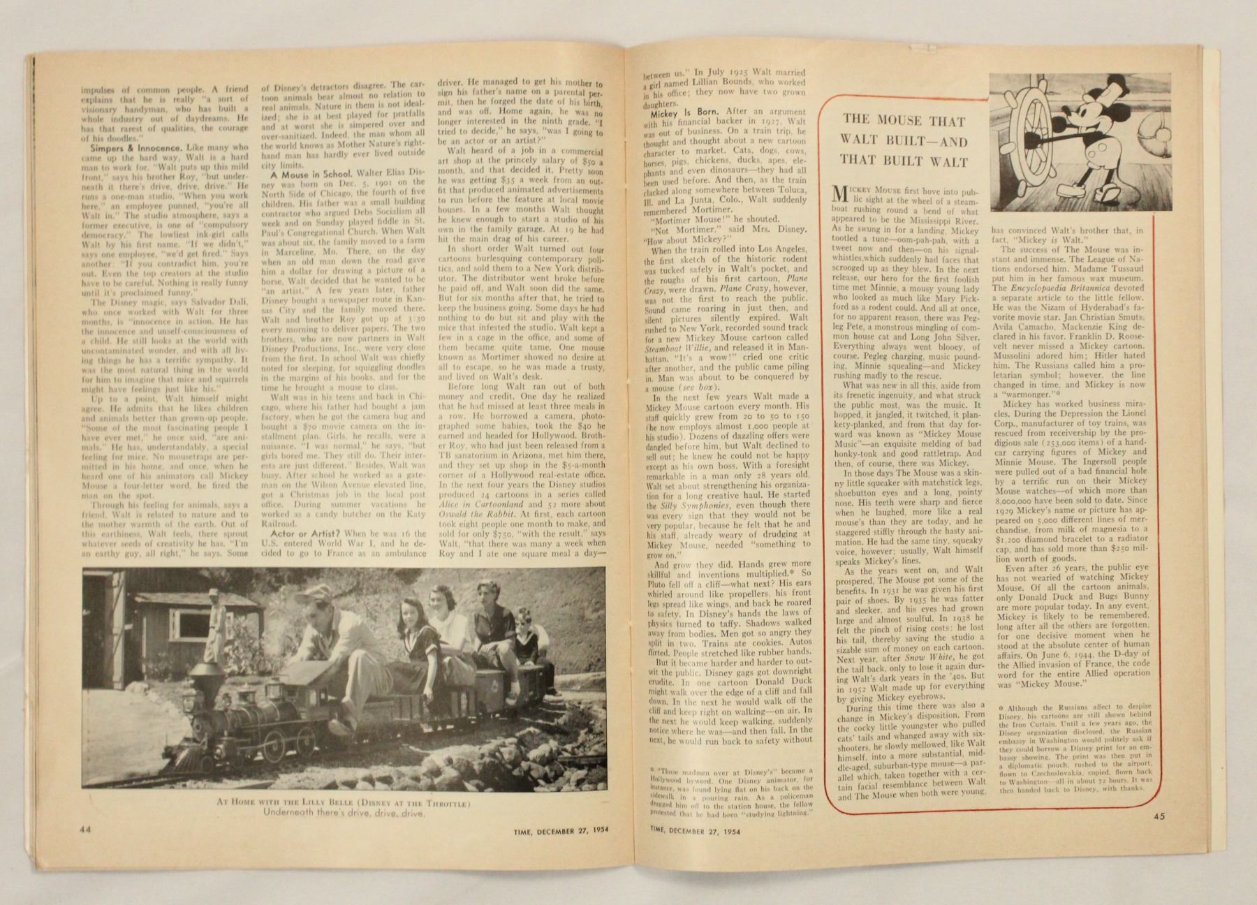 (Time Magazine, 1954) Walt Disney and his cast of characters dominate the cover of this 1954 Time Magazine Volume 64, Number 26. The magazine is in good condition with some creases, corner bends and edge wear from use. The cover does have some ink marks around Dumbo.