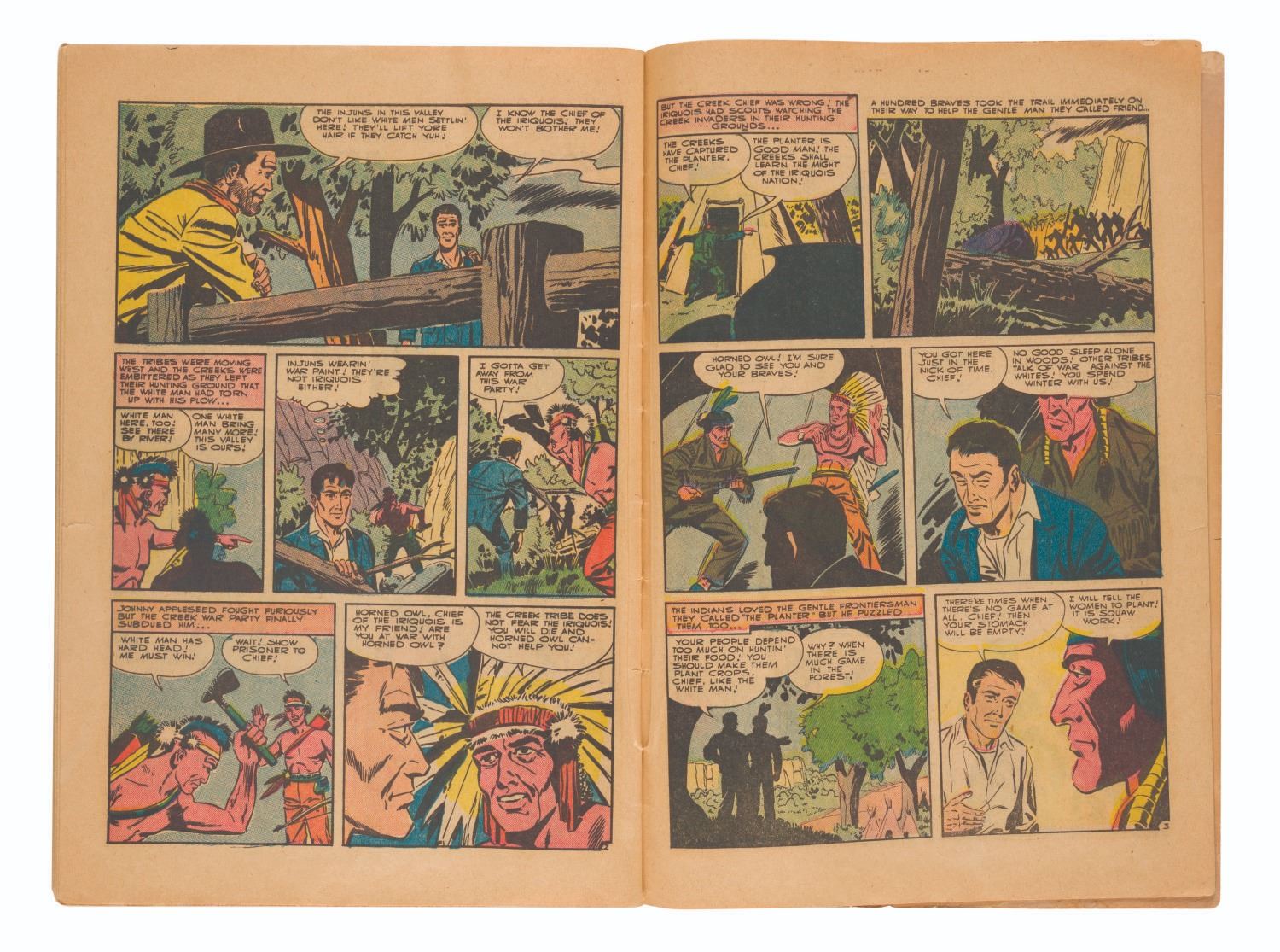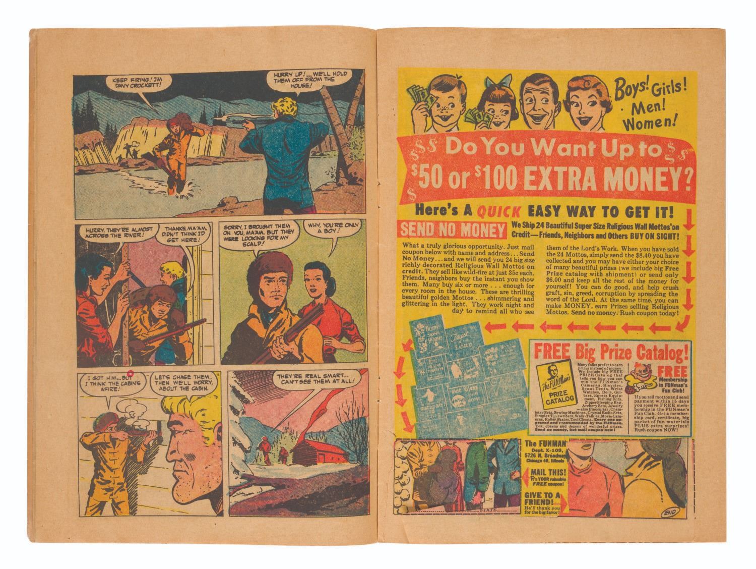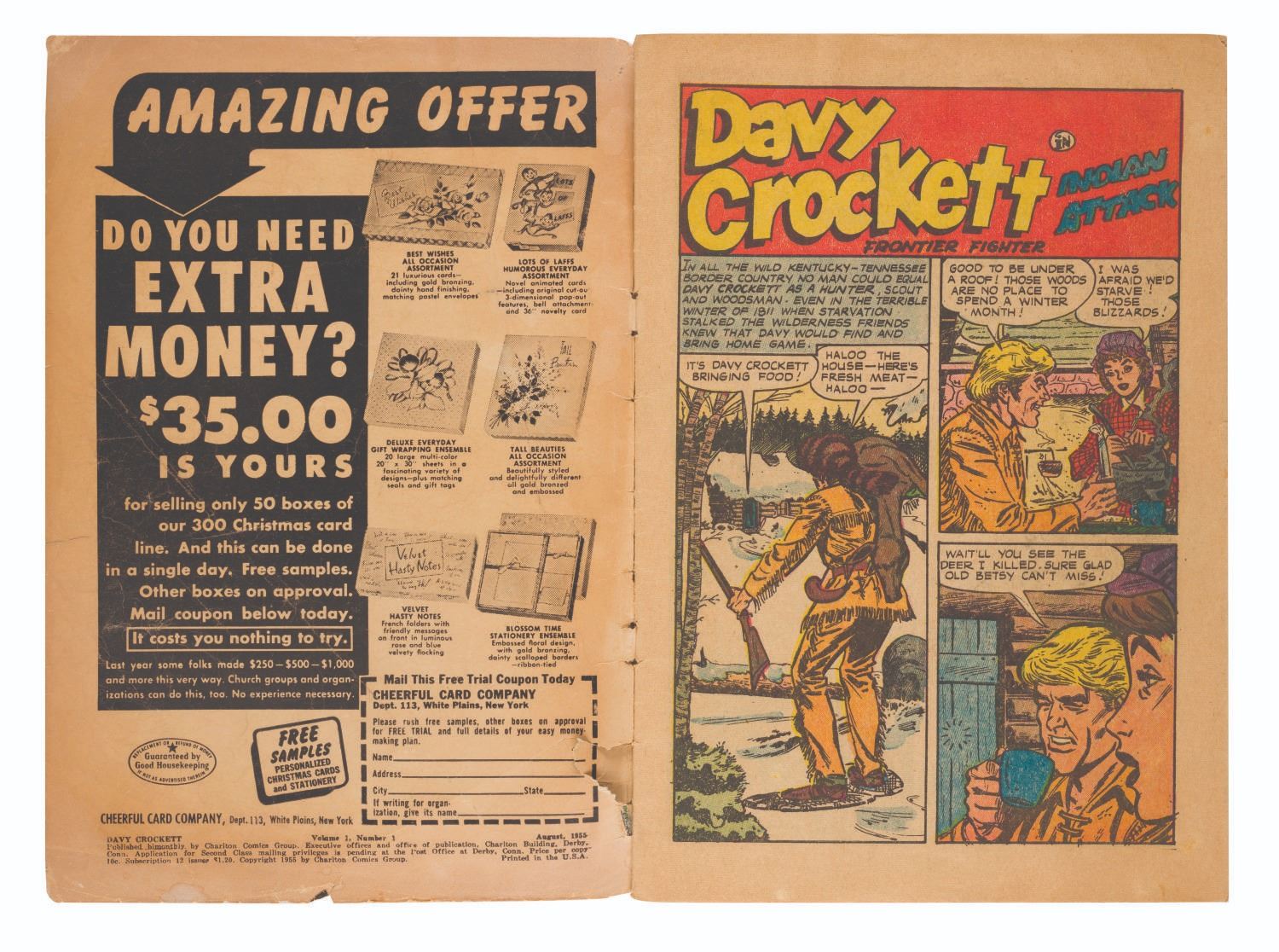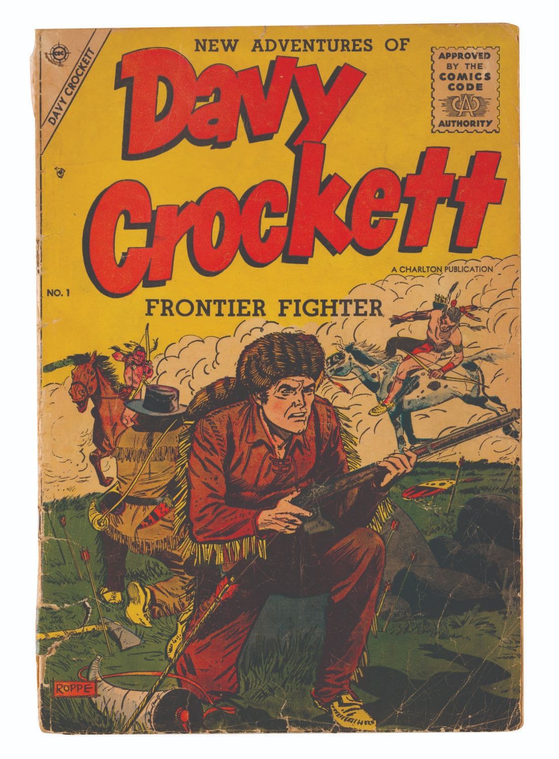 (Charlton, 1955) An August 1955 issue number 1 of Davy Crockett Frontier Fighter. The comic book is in fair condition with creases and edge wear to the cover, heavy wear along the spine, including 1.5" and 2" tears at the top and bottom, and two coupons cut from one interior page.