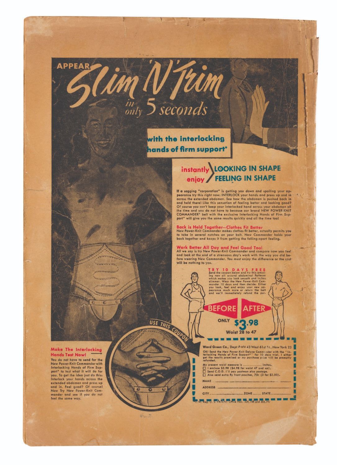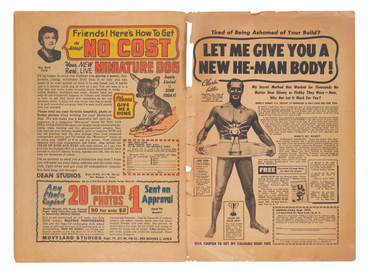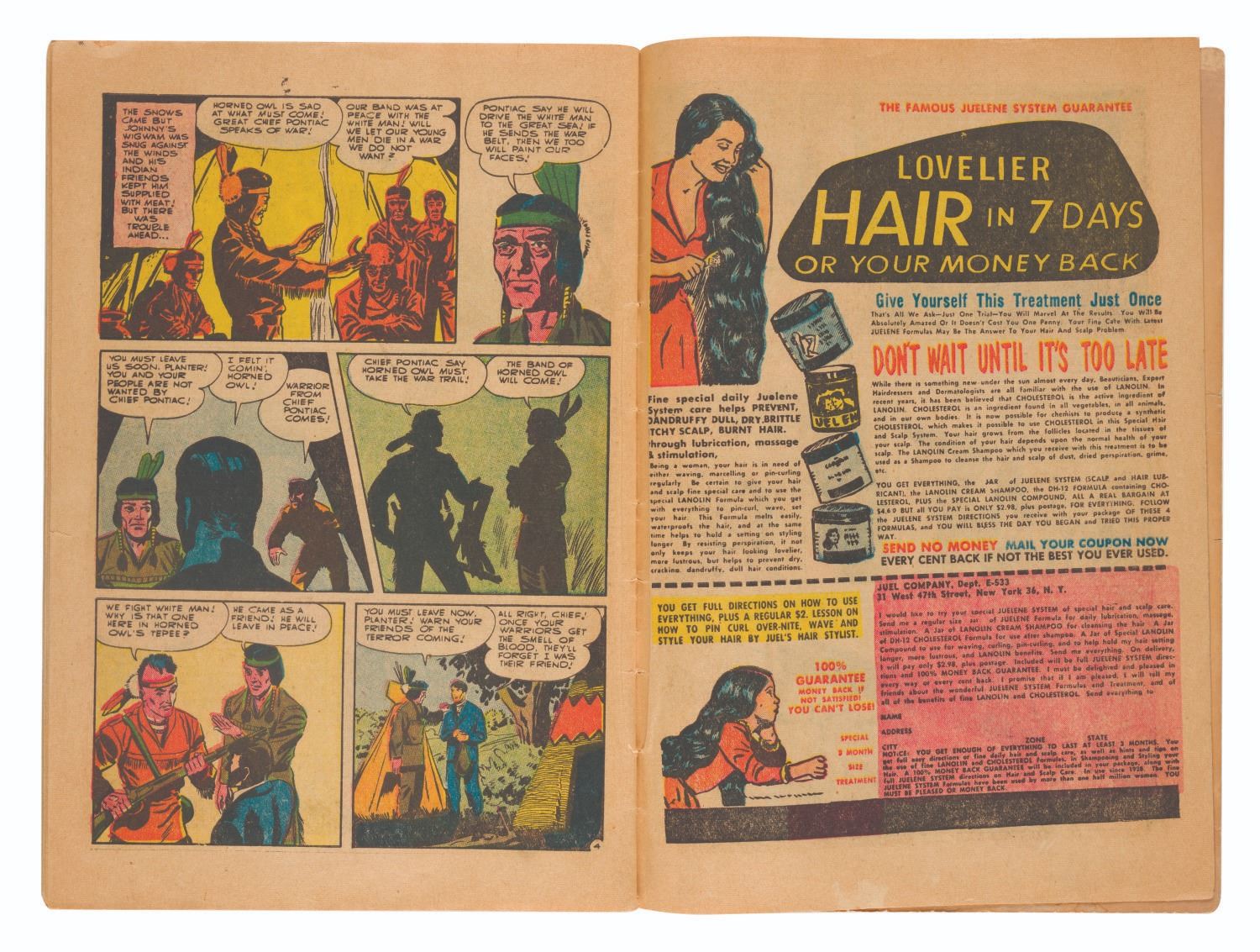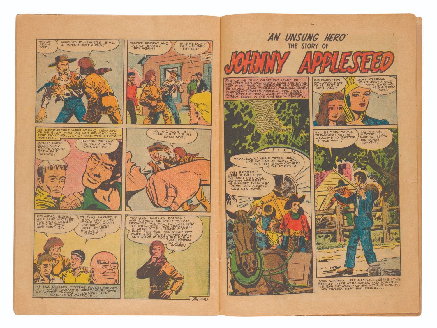 (Charlton, 1955) An August 1955 issue number 1 of Davy Crockett Frontier Fighter. The comic book is in fair condition with creases and edge wear to the cover, heavy wear along the spine, including 1.5" and 2" tears at the top and bottom, and two coupons cut from one interior page.