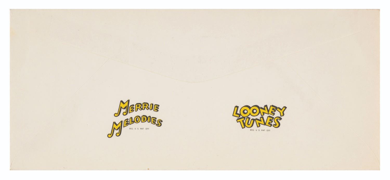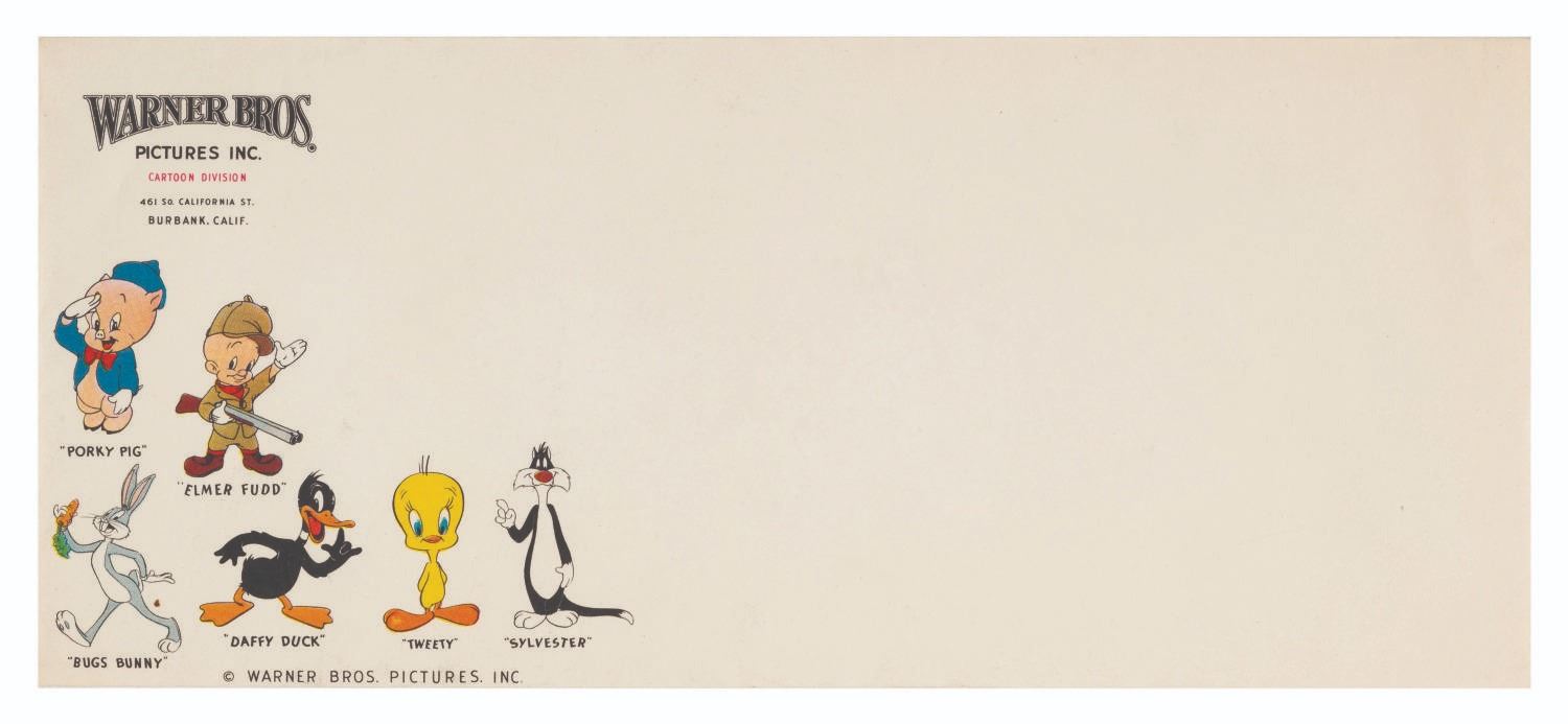 (Warner Bros., 1955) A Warner Brothers Cartoon Division letter-sized envelope. Upon moving to Burbank in 1955, the Cartoon division’s first address was 461 S. California St. on the eastern side of the Warner Brothers Studio lot. The envelope pictures their most popular characters on the front, with Looney Tunes and Merrie Melodies logos on the back. Measuring 9.5” x 4.25” the envelope is in fine unused condition, with very light wear from age.