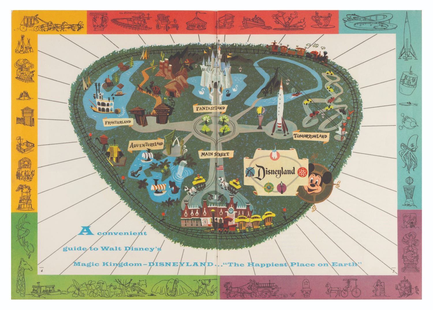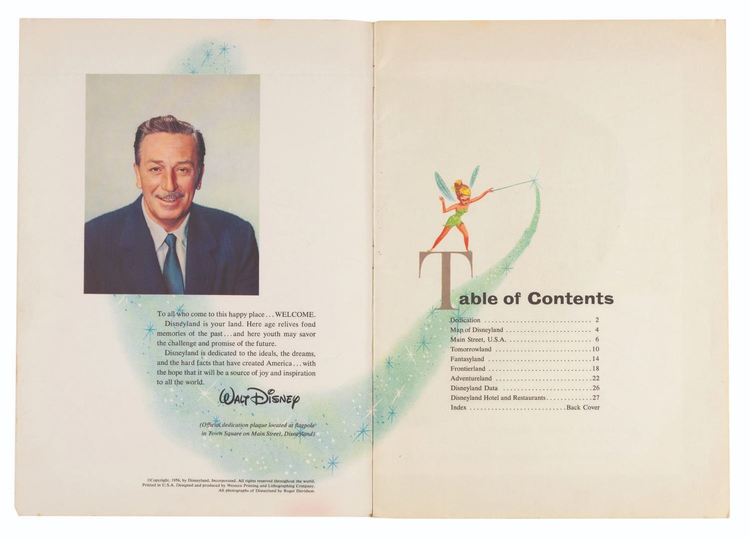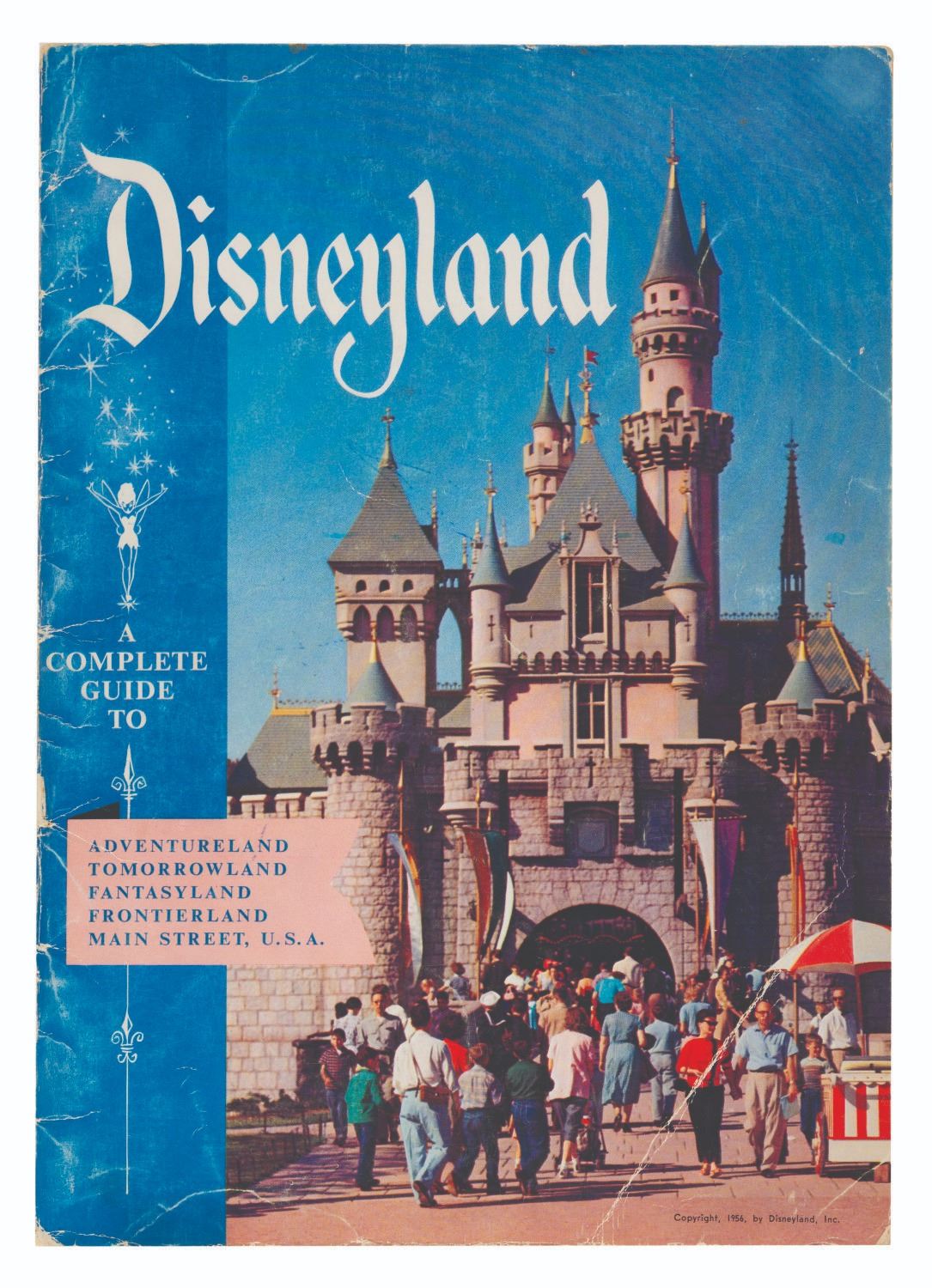 (Disneyland, 1956) An early Complete Guide to Disneyland book. The 27-page souvenir guidebook provides illustrations, full-color photographs, and maps of the Park. Measuring 8.25" x 11.5", the guide is in fair condition with visible crease lines on the front cover and along the spine, as well as color loss due to surface wear and some paper loss on the spine.