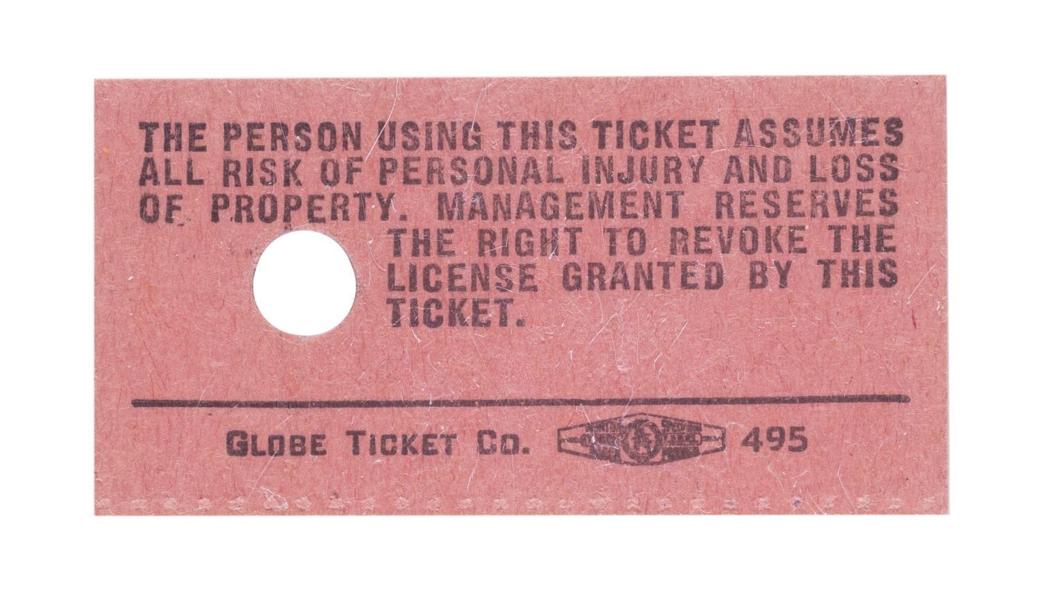 (Disneyland, 1956) A Disneyland Main Gate Adult Admission Ticket from 1956. Although the popular Disneyland Coupon Books had been introduced in late 1955, single admission tickets were still available for purchase. The ticket has a $1.00 value and is numbered "004798." Measuring 2"x1", the ticket is in fine condition with only light wear.