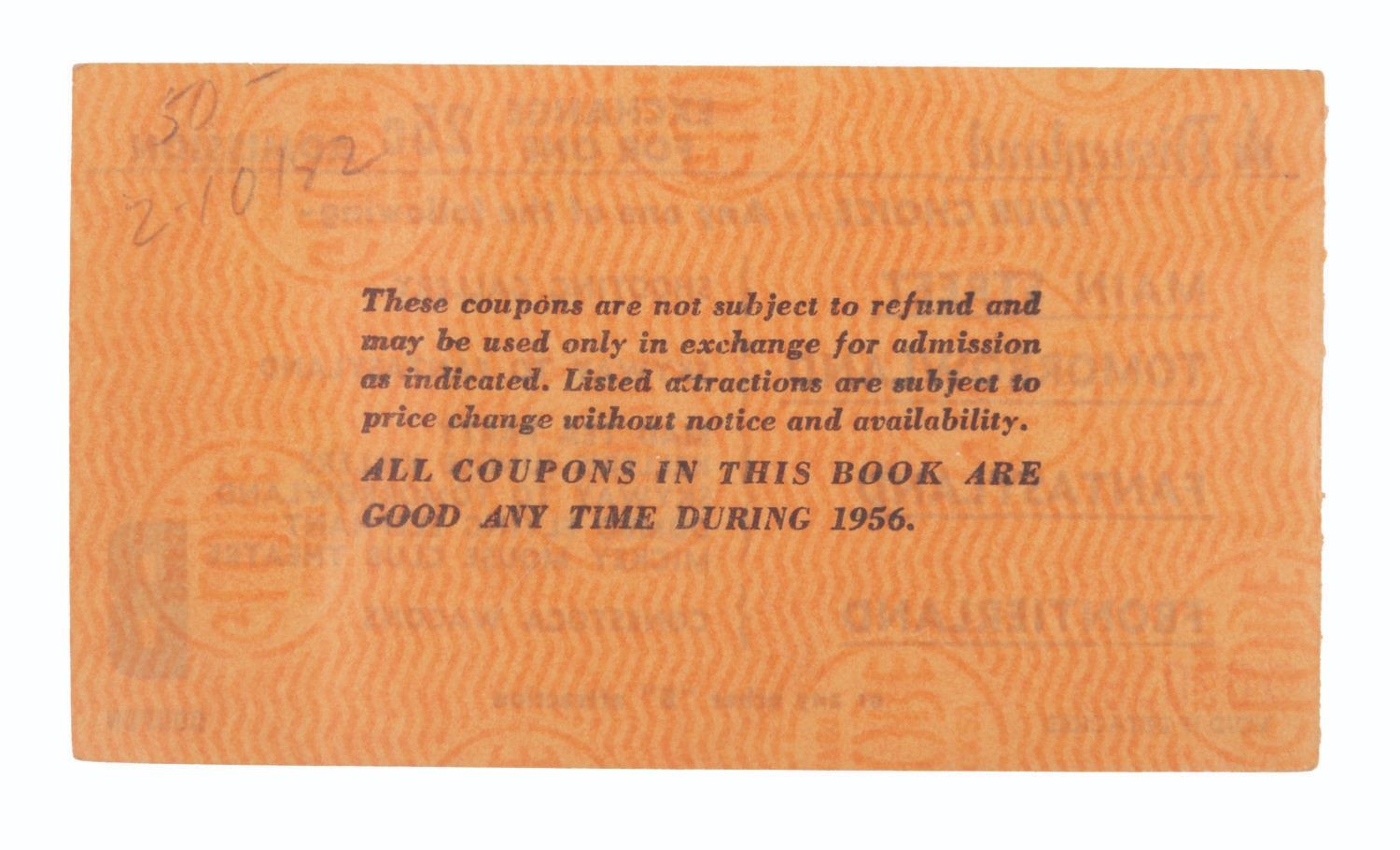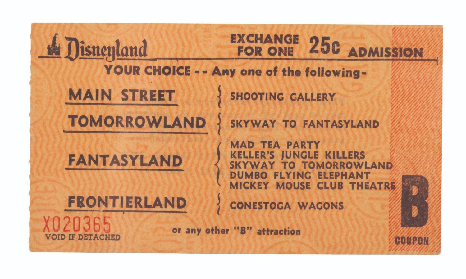 (Disneyland, 1956) A “B” ticket from a 1956 ticket book. Featured is “Keller’s Jungle Killers,” a live cat act that debuted in Disneyland as part of the Mickey Mouse Club Circus, and became it’s own attraction for seven months starting in February of 1956. Measuring 2.5” x 4.5”, the ticket is in very good condition.