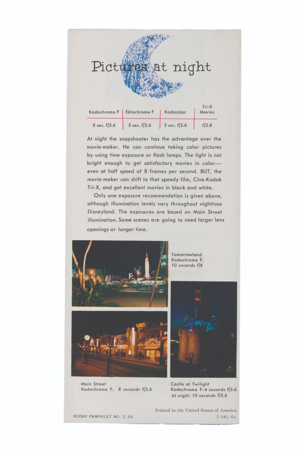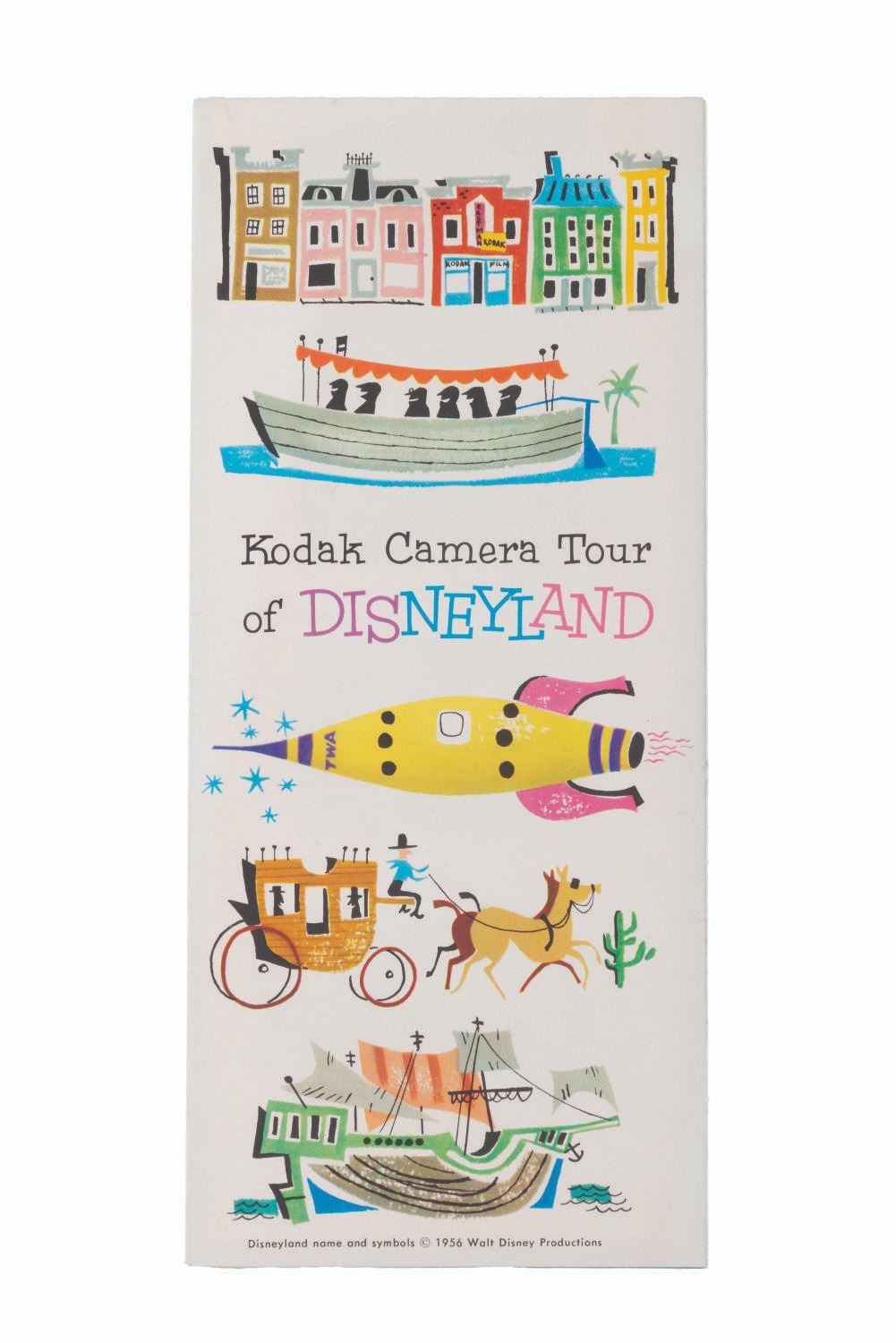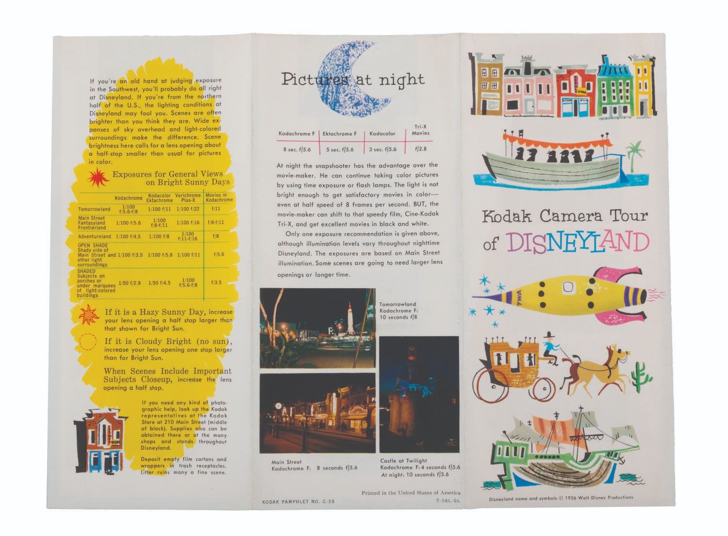 (Kodak, 1956) A Kodak Camera tour of Disneyland pamphlet giving tips and exposures for photographing the different attractions in Disneyland. Measurng 8.25” x 3.75”, the pamphlet displays in very good condition with a 1” tear along one interior fold.
