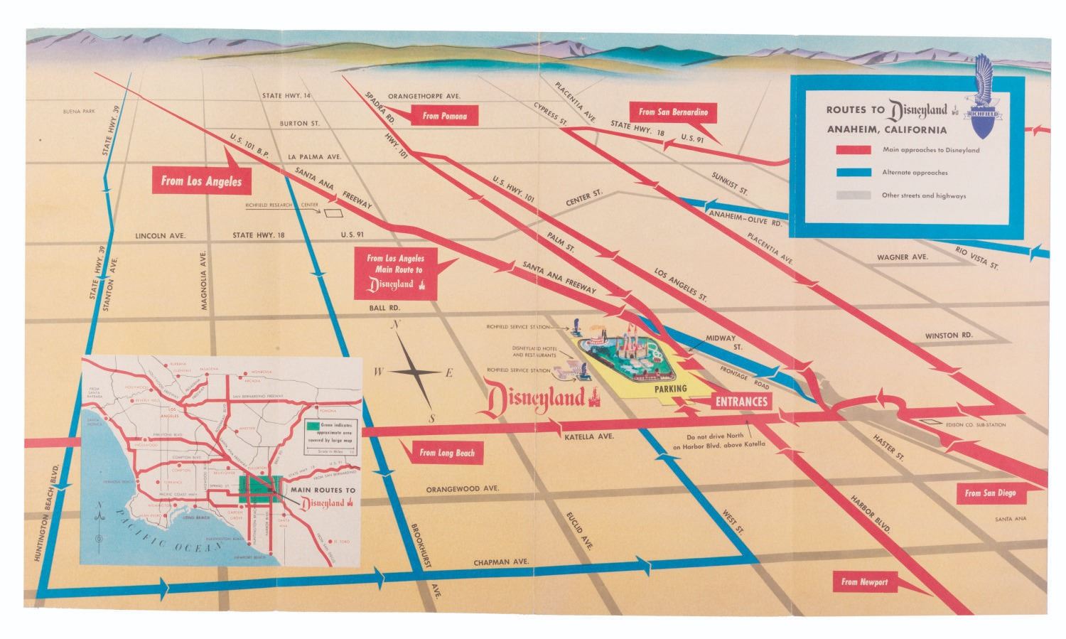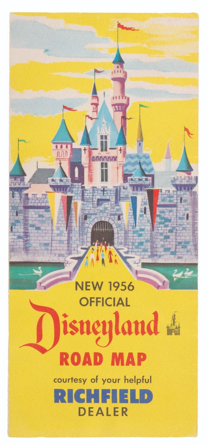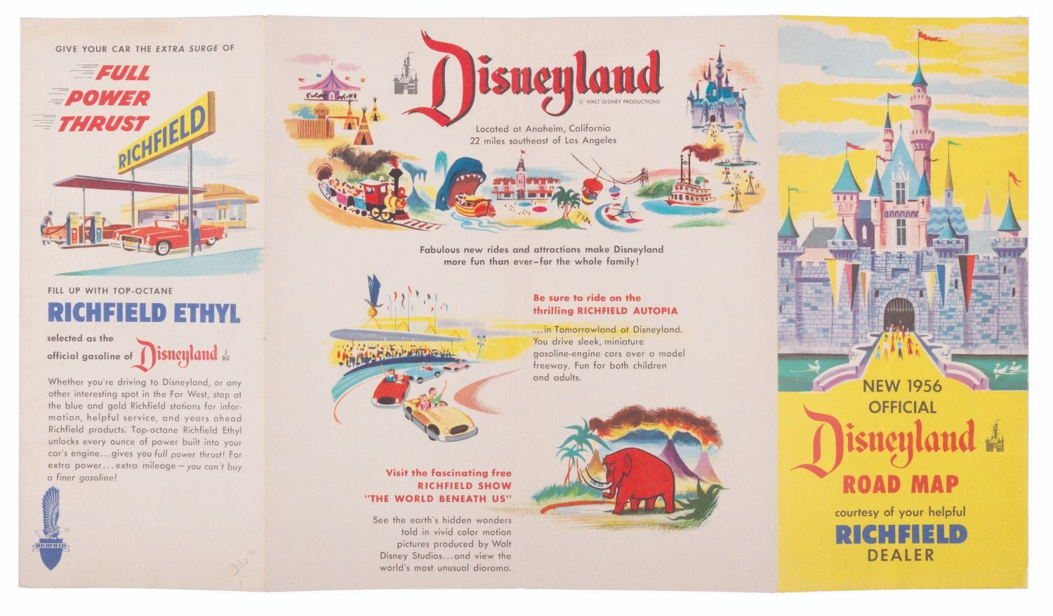 (Disneyland, 1956) A very rare promotional New 1956 Official Disneyland Road Map provided courtesy of Richfield Dealers. This map features a beautiful depiction of Sleeping Beauty Castle on the front, and opens to reveal a California map with the main and alternate routes to Disneyland. The back side features ads for Richfield and its attractions at the Park. Measuring 4" x 9", the map is in very good condition with light creases, handling wear, discoloration from age, and a pencil inscription on the reverse.