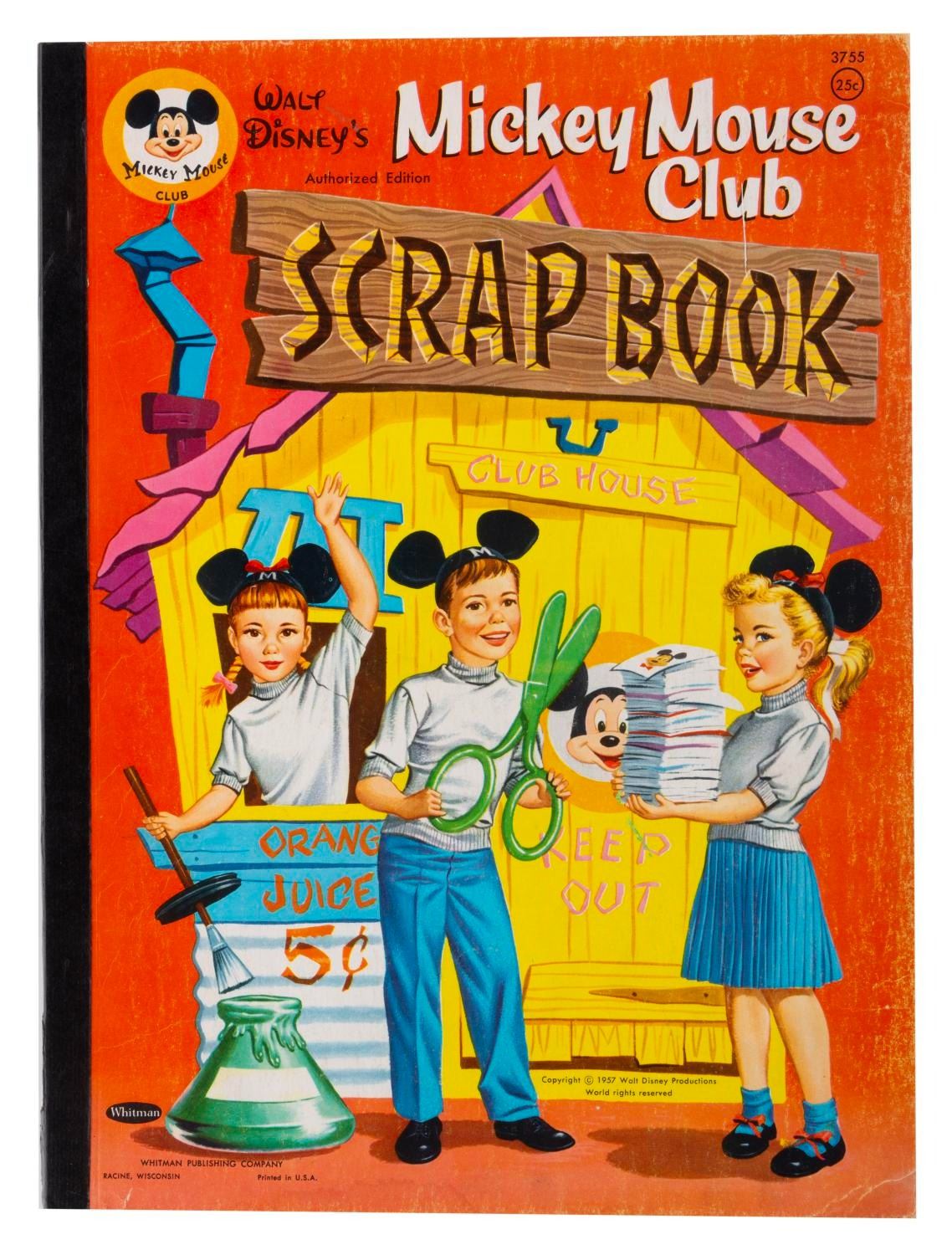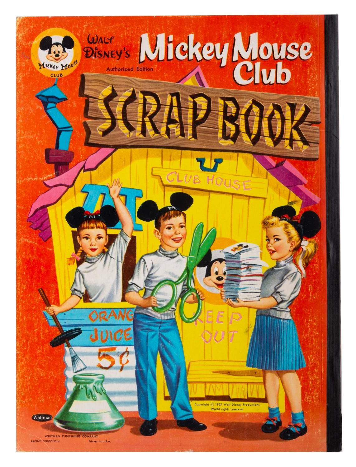 (Western Publishing, 1957) A Mickey Mouse Club Scrapbook, with blank pages to fill. Measuring 10" x 13.5", the scrapbook is in very good condition with wear to the cover including faint scuffs overall, and a stamp inside from the Western Publishing library.