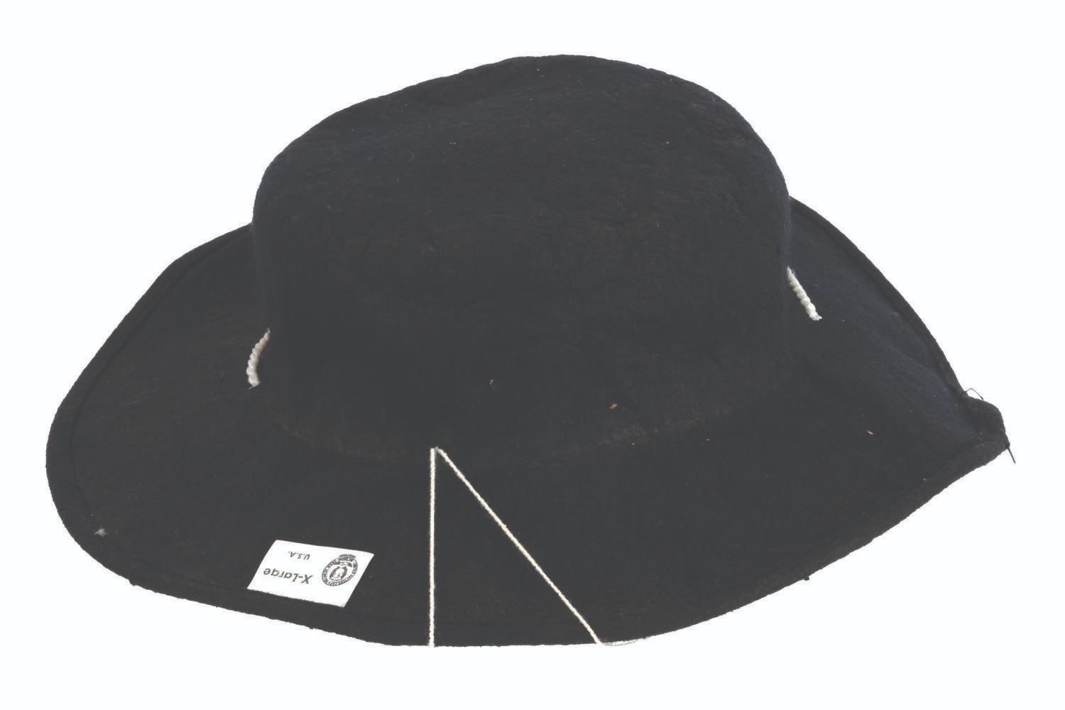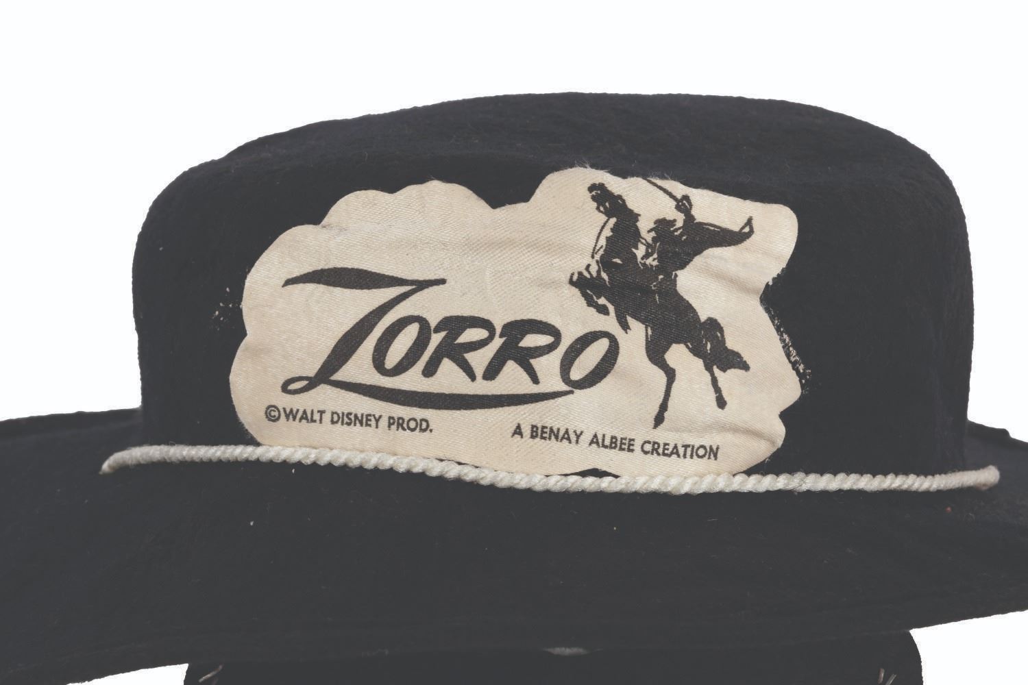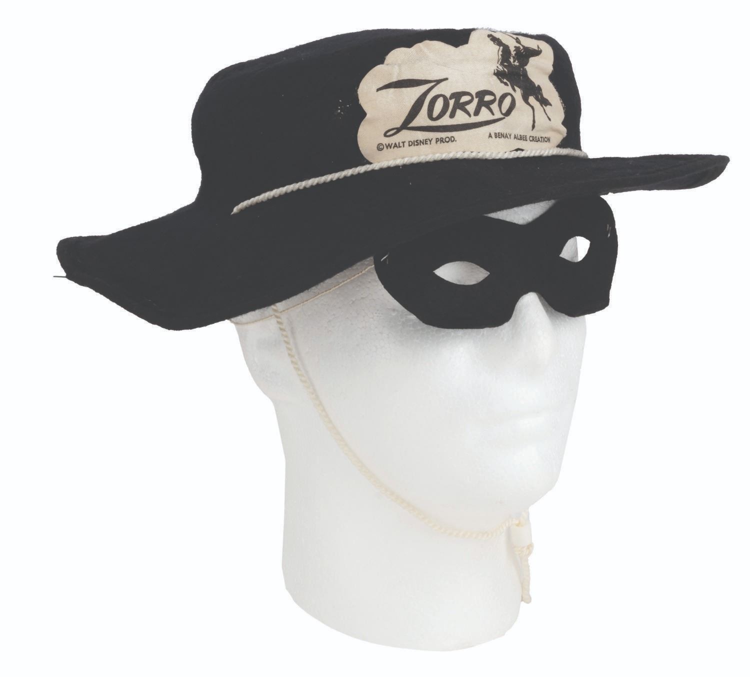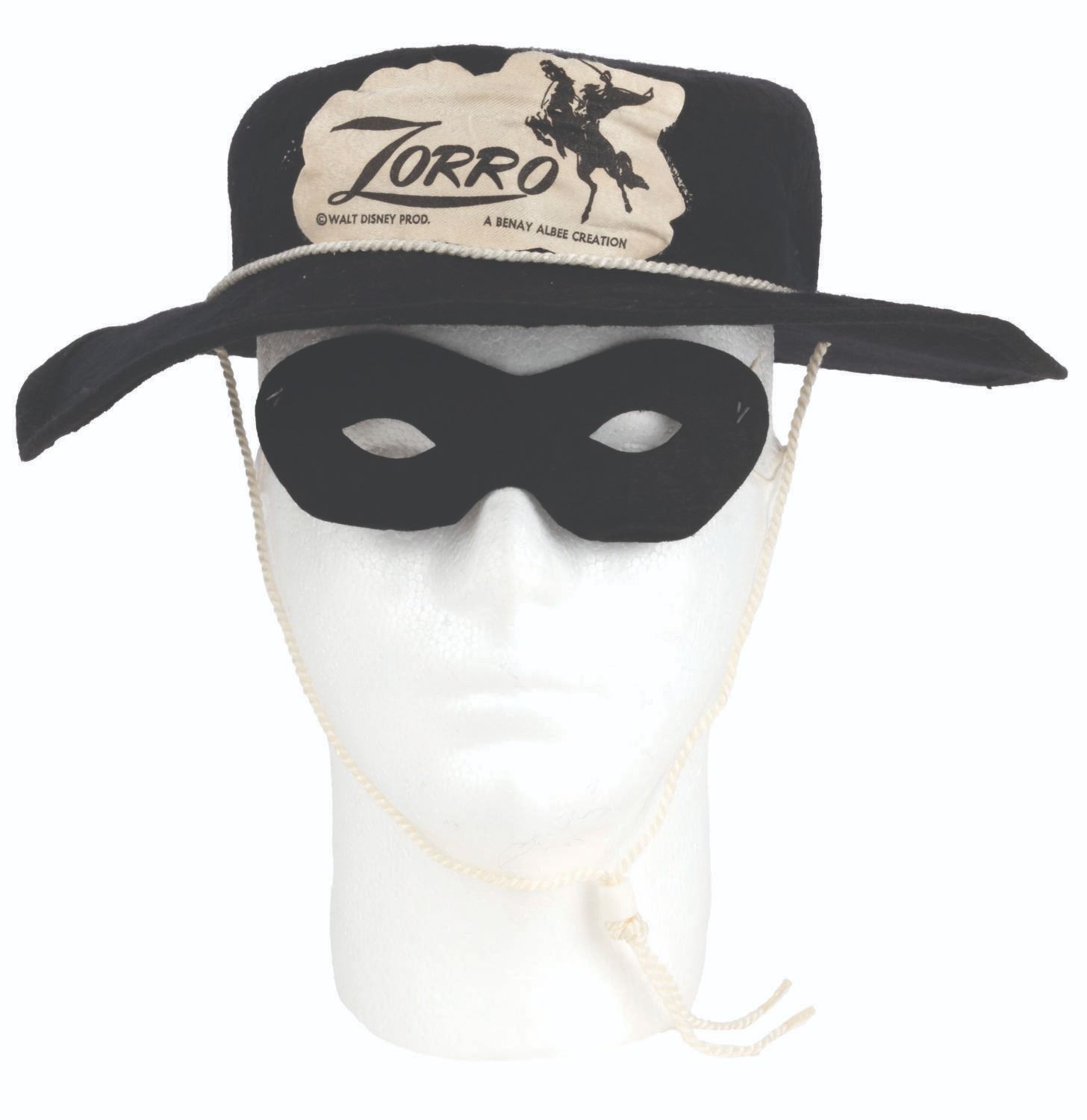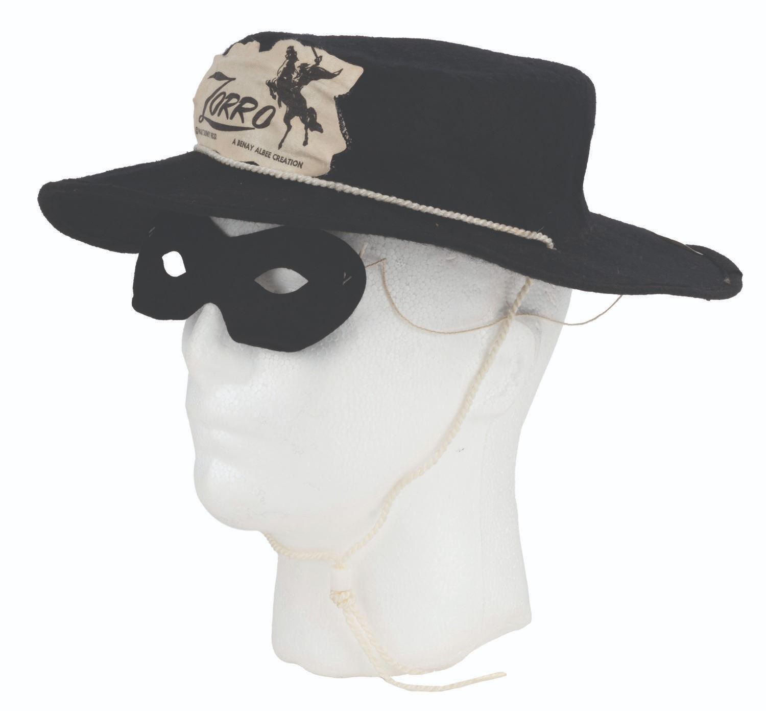 (Benay-Albee, 1957) A very rare Zorro felt hat and mask. The hat is labeled "XL" and measures 12" diameter x 2.5" high. The mask is 5.5" x 2.5". Both pieces are in good condition with light wear from use.