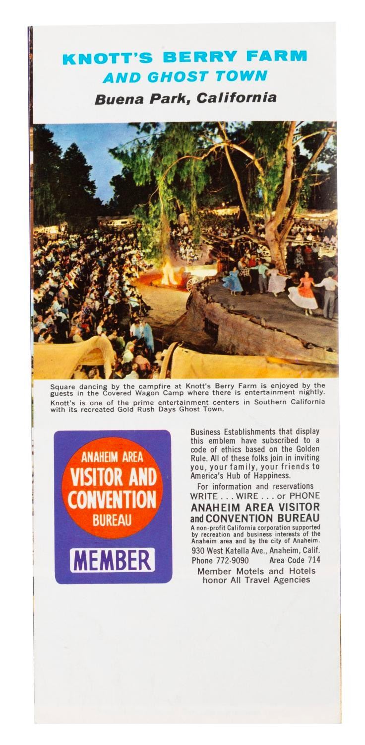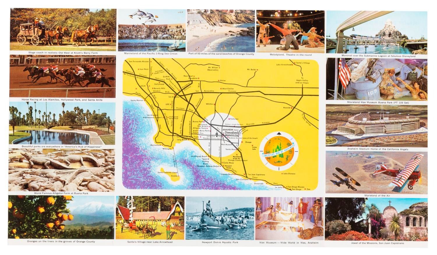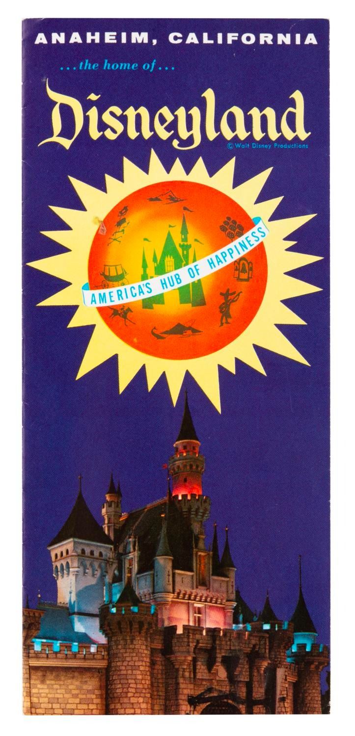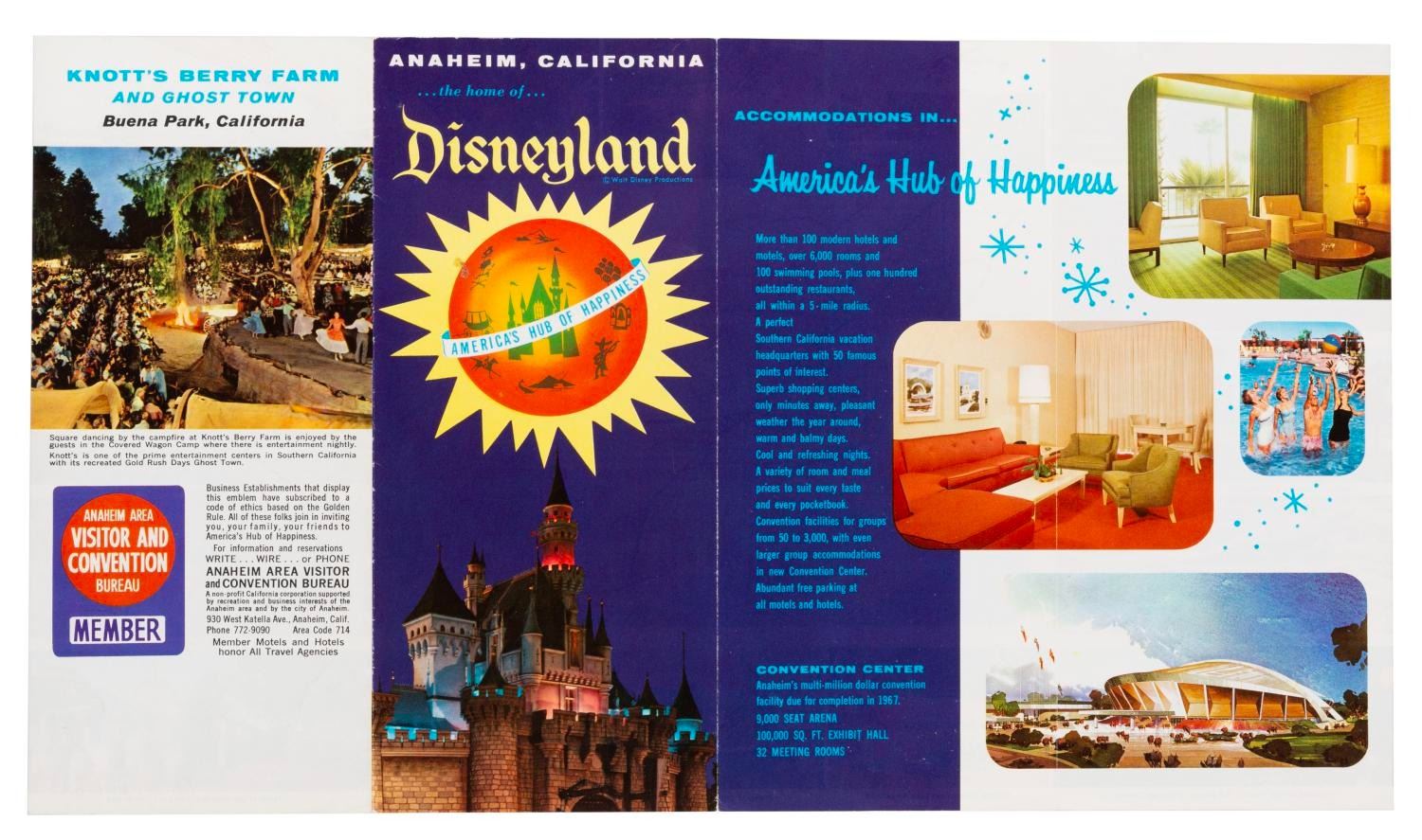 (Anaheim, 1960s-70s) An Anaheim promotional brochure touting the area as "America's Hub of Happiness," with Sleeping Beauty Castle on the cover. Measuring 4" x 9", the brochure is in good condition with creases and handling wear.