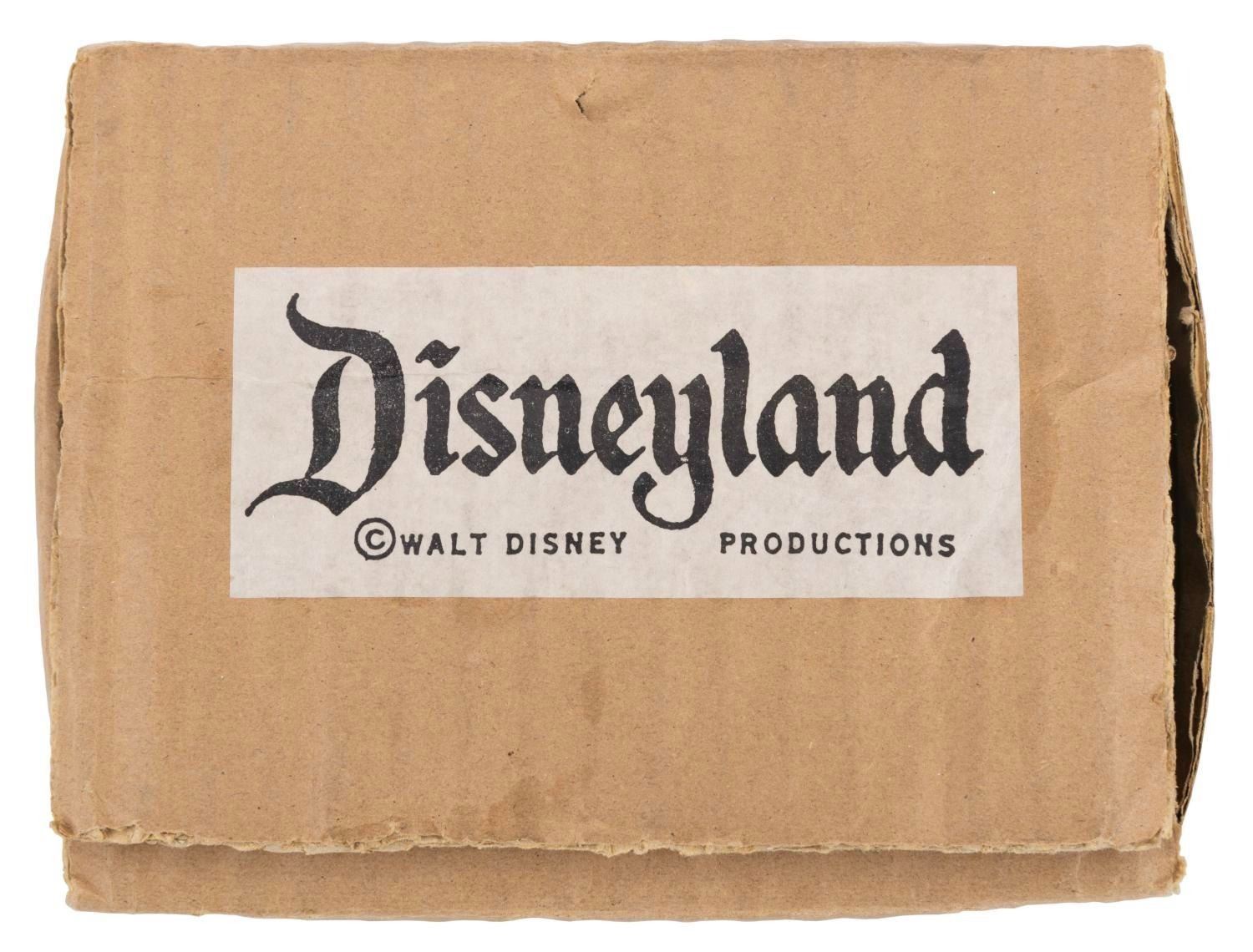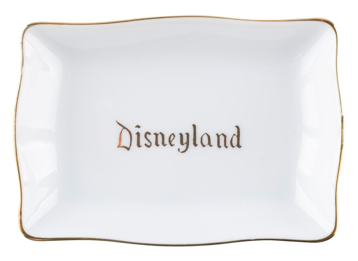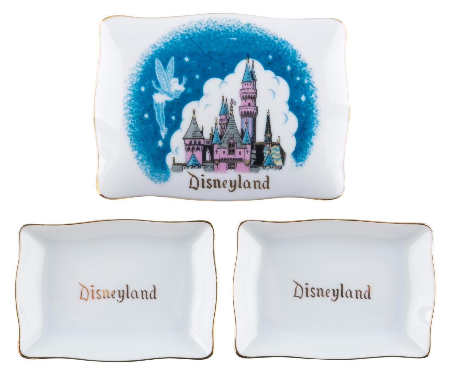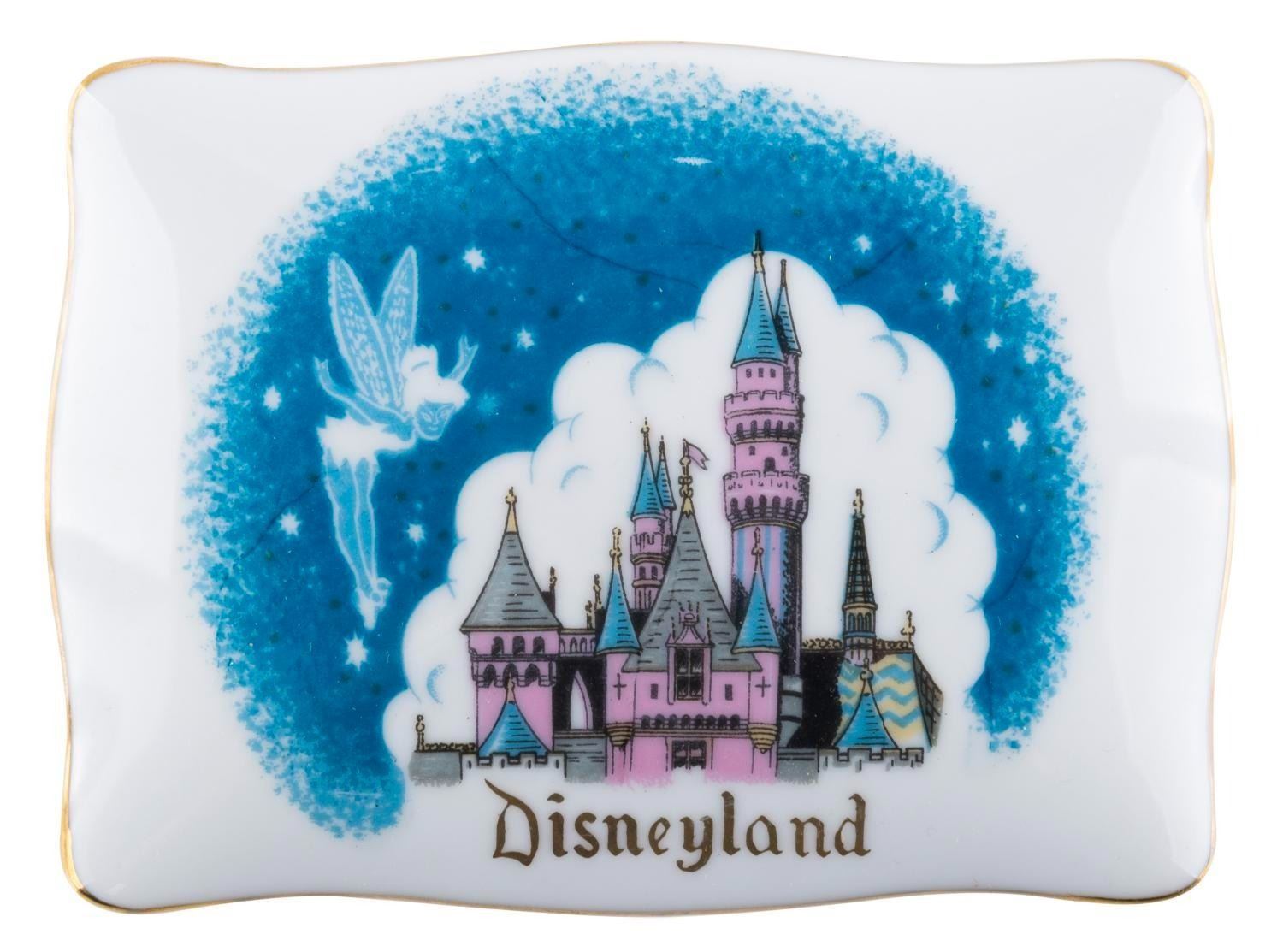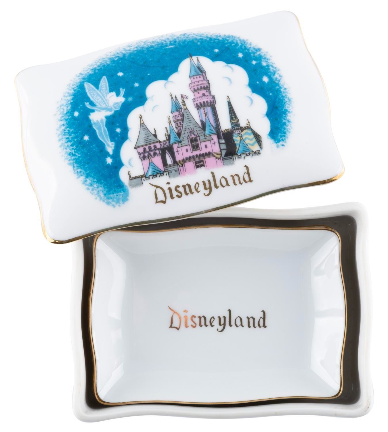 (Disneyland 1960s) A souvenir ceramic ashtray set featuring Sleeping Beauty Castle. These ceramic boxes were referred to in the Souvenirs From Disneyland catalog as a smoker set and a candy dish set. Measuring 2.75” x 4” and 3.5” x 4.75” x 2” tall respectively, the ashtrays and box are in very good condition with a small chip on the box lid, light scratches, sticker residue on the interior of the lip, and tape residue on the bottom of the box.