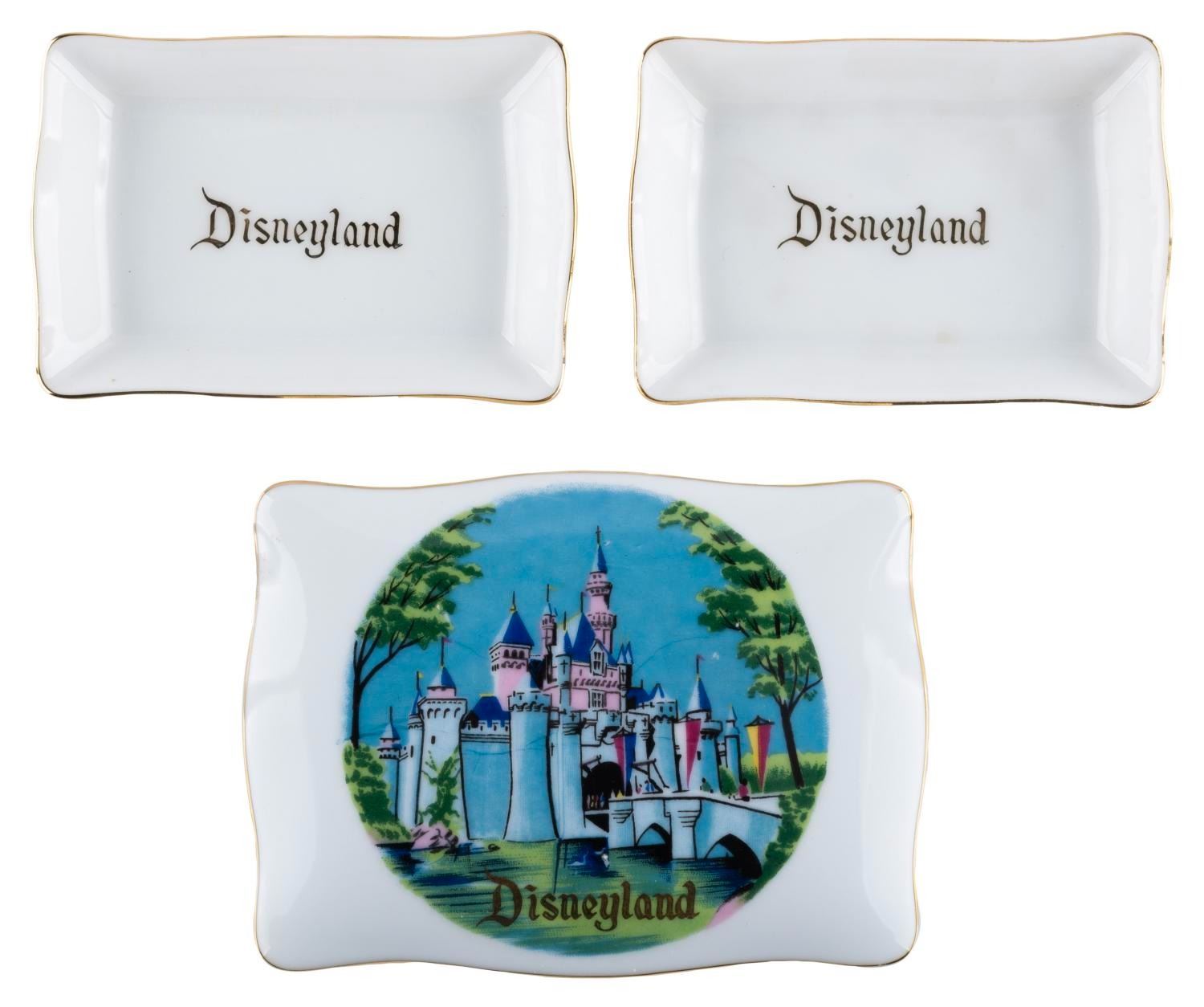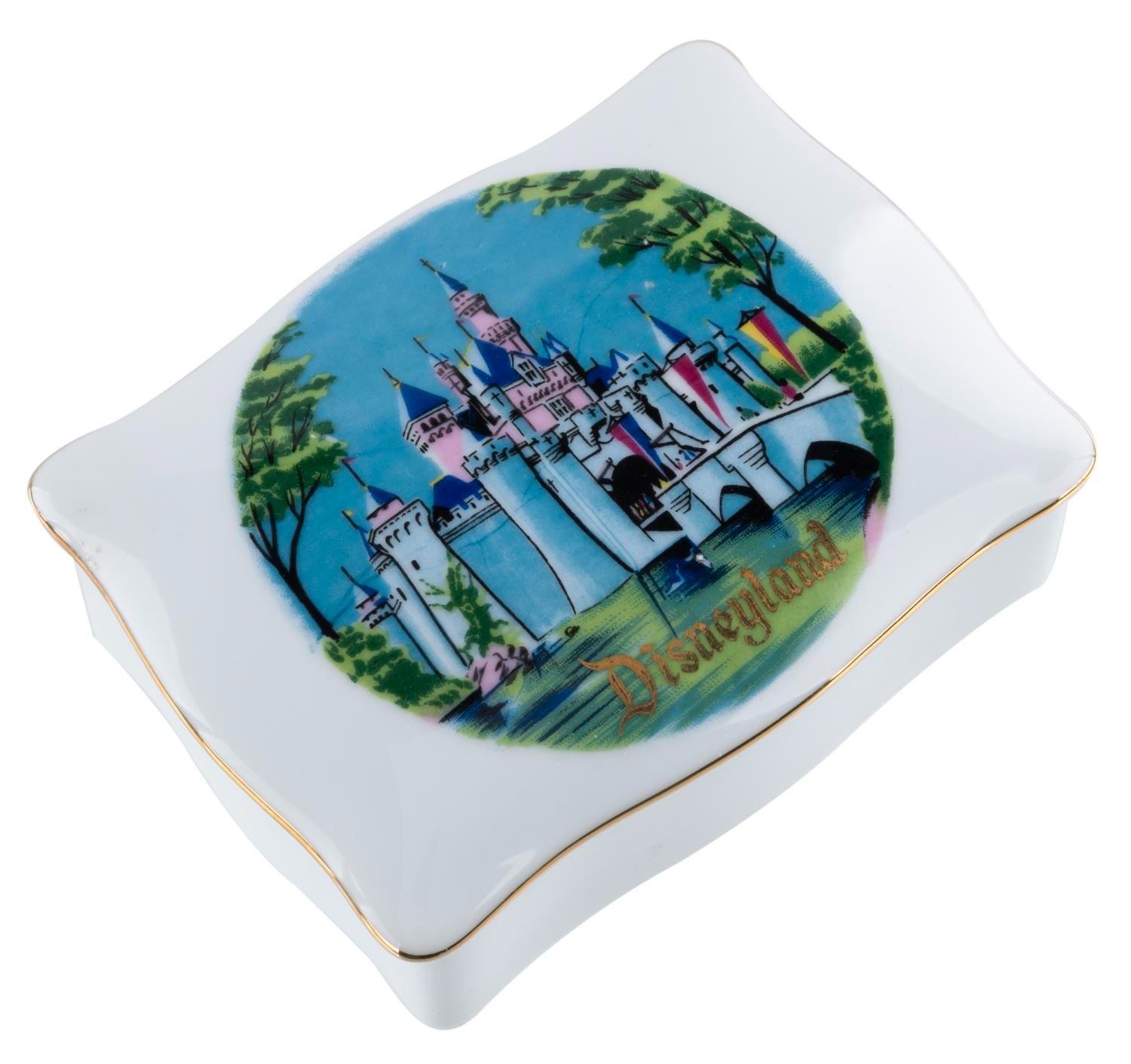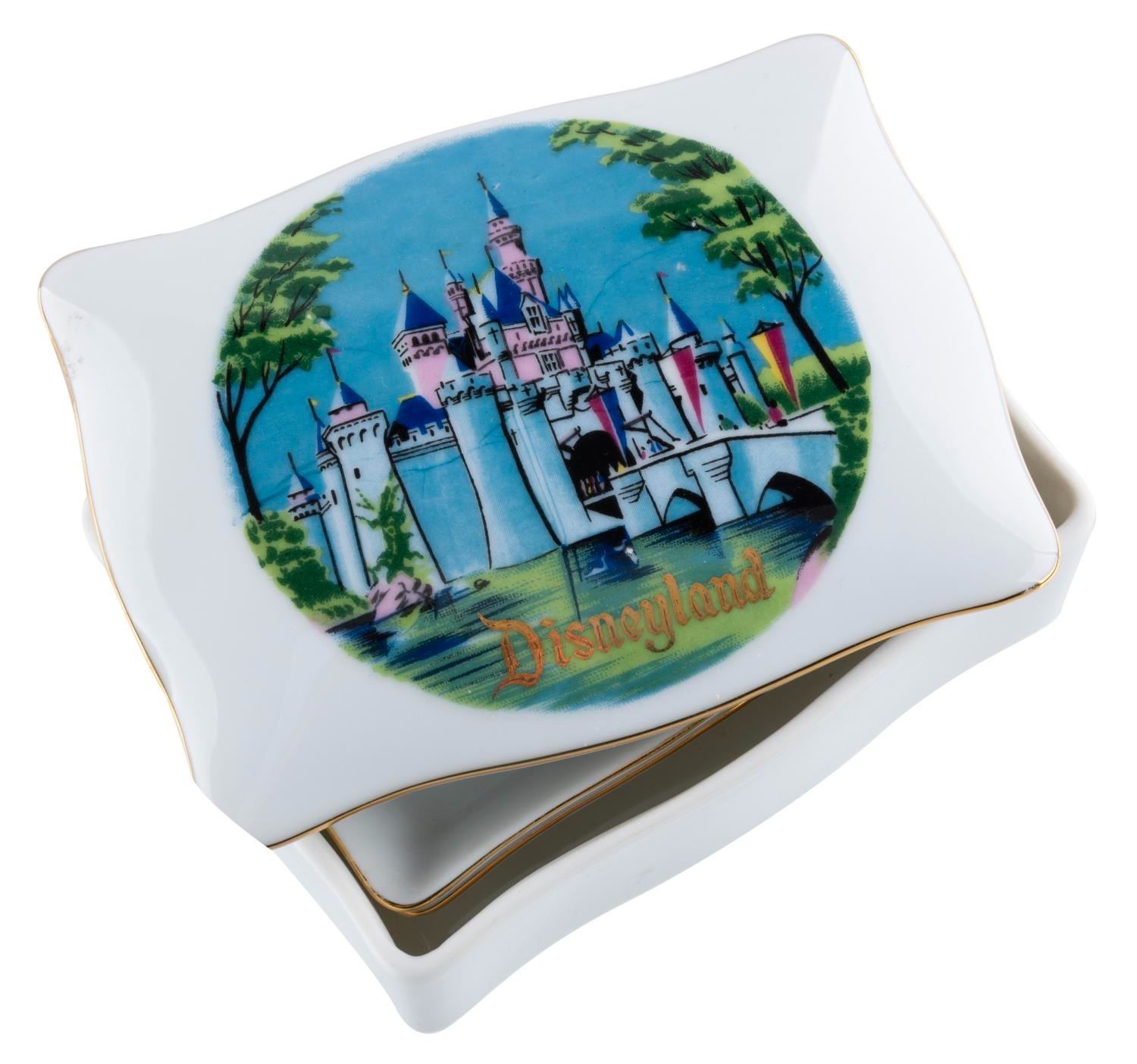 (Disneyland, 1960s) A souvenir ceramic box featuring Sleeping Beauty Castle and containing two Disneyland ashtrays. Each ashtray measures 4" x 3" x 0.5", and the holder measures 5.5" x 4" x 2." The set is in very good condition with some wear from age and tape residue on the bottom.