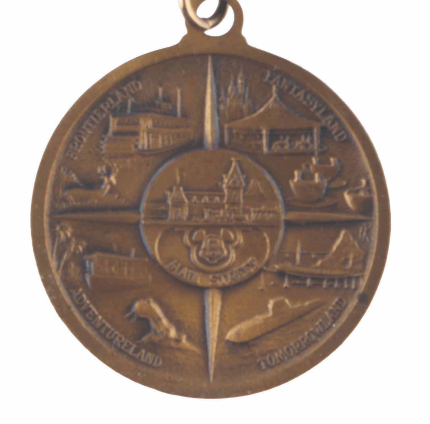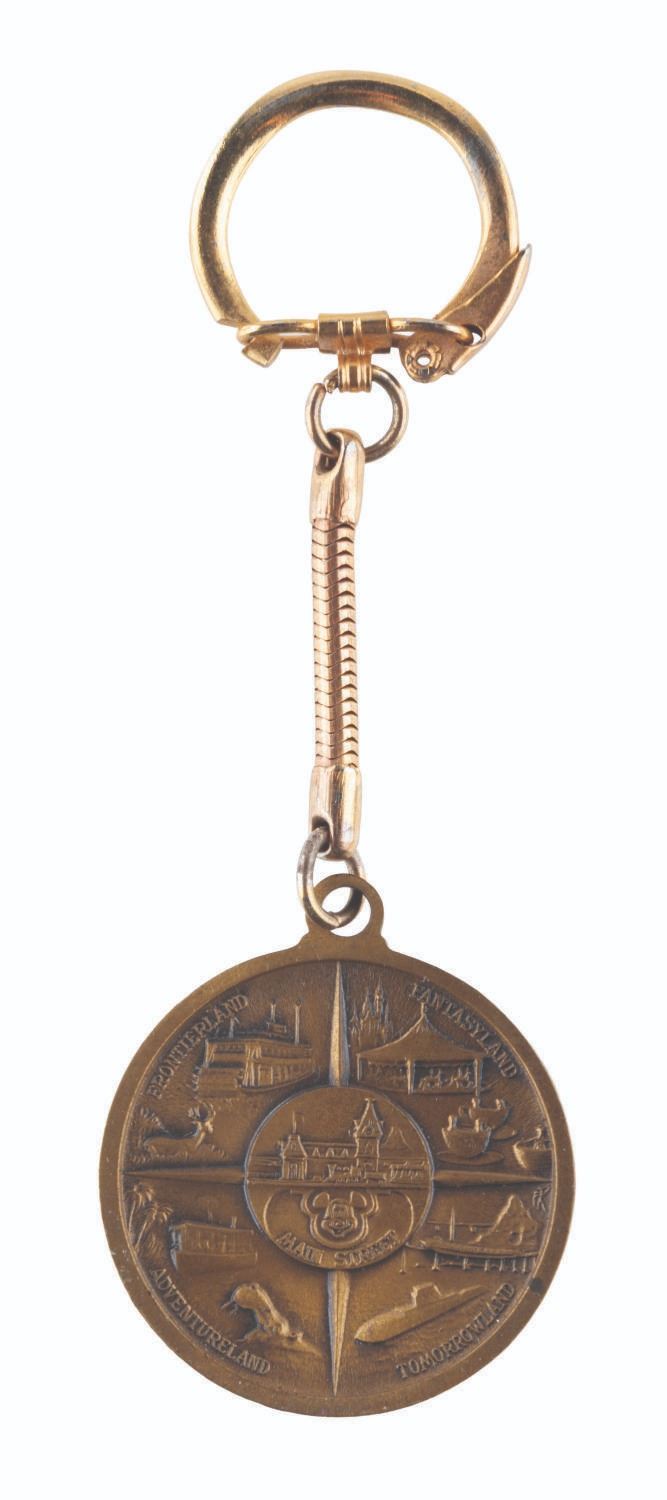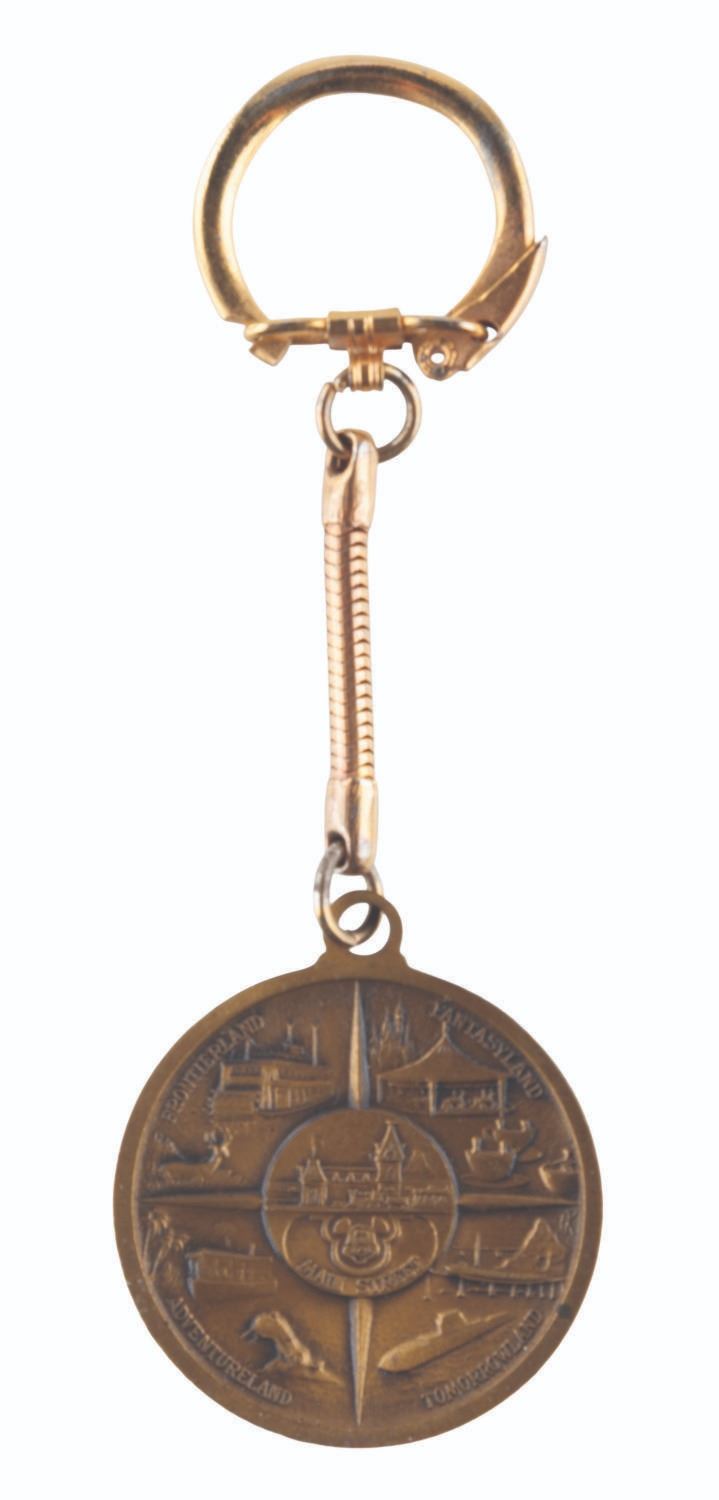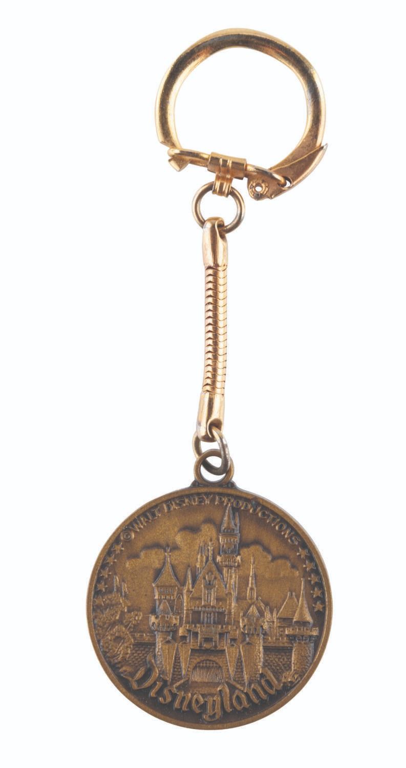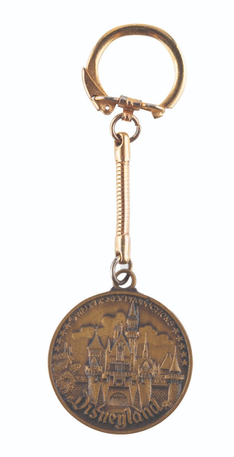(Disneyland, 1960s) A Disneyland coin keychain featuring Sleeping Beauty Castle on one side and the original 5 Park "lands" on the other. Measuring 1.5" in diameter and 4" long, the keychain is in very good condition with a spot of oxidation.